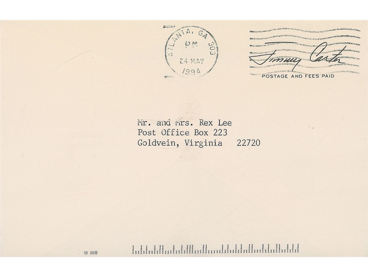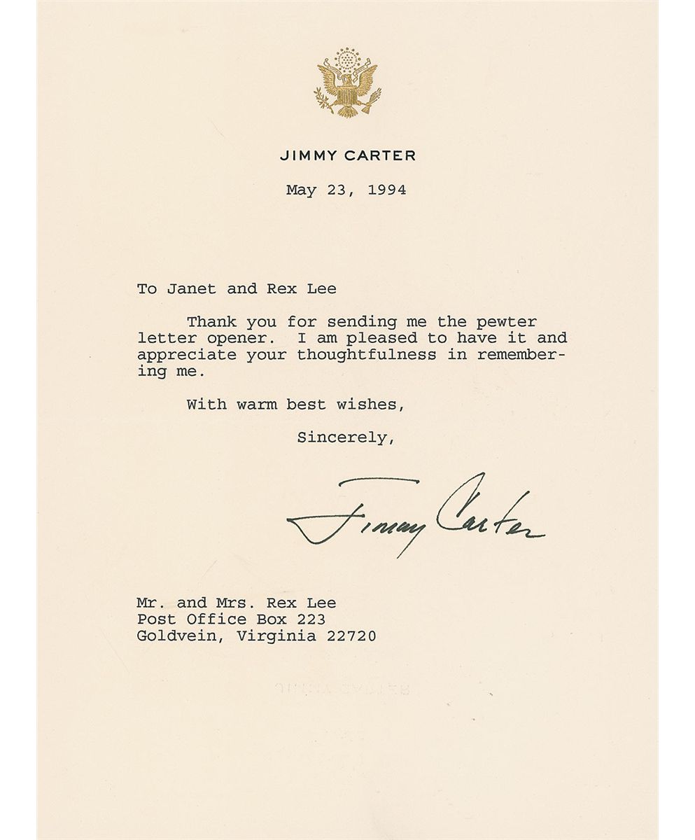TLS, one page, 6.5 x 8.5, personal letterhead, May 23, 1994. Short letter of thanks for a gift. In full: “Thank you for sending me the pewter letter opener. I am pleased to have it and appreciate your thoughtfulness in remembering me.” In very fine condition. Accompanied by the original mailing envelope.