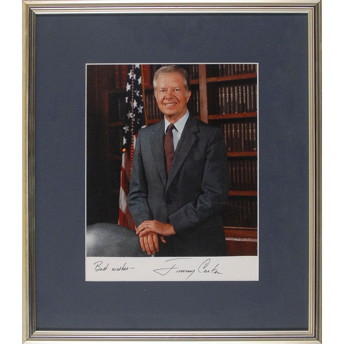 Color satin-finish 7.5 x 9.5 photo of Carter in a half-length pose, signed in the lower border in black felt tip, “Best wishes—Jimmy Carter.” Nicely matted and framed to an overall size of 13.5 x 15.5. In fine condition.
