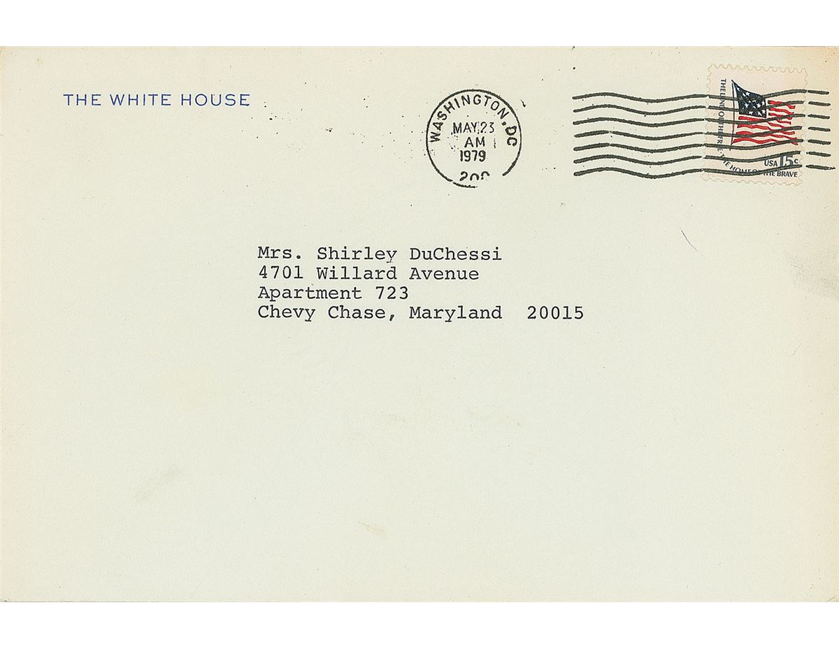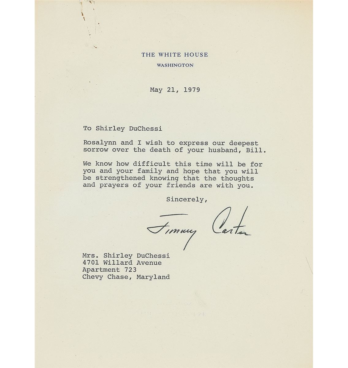 TLS as president, one page, 6.75 x 8.75, White House letterhead, May 21, 1979. Letter to Shirley DuChessi. In full: “Rosalynn and I wish to express our deepest sorrow over the death of your husband, Bill. We know how difficult this time will be for you and your family and hope that you will be strengthened knowing that the thoughts and prayers of your friends are with you.” A rusty paperclip impression to the upper left, otherwise fine condition. Accompanied by the original mailing envelope. Bill DuChessi was a leader of the Textile Workers Union of America.