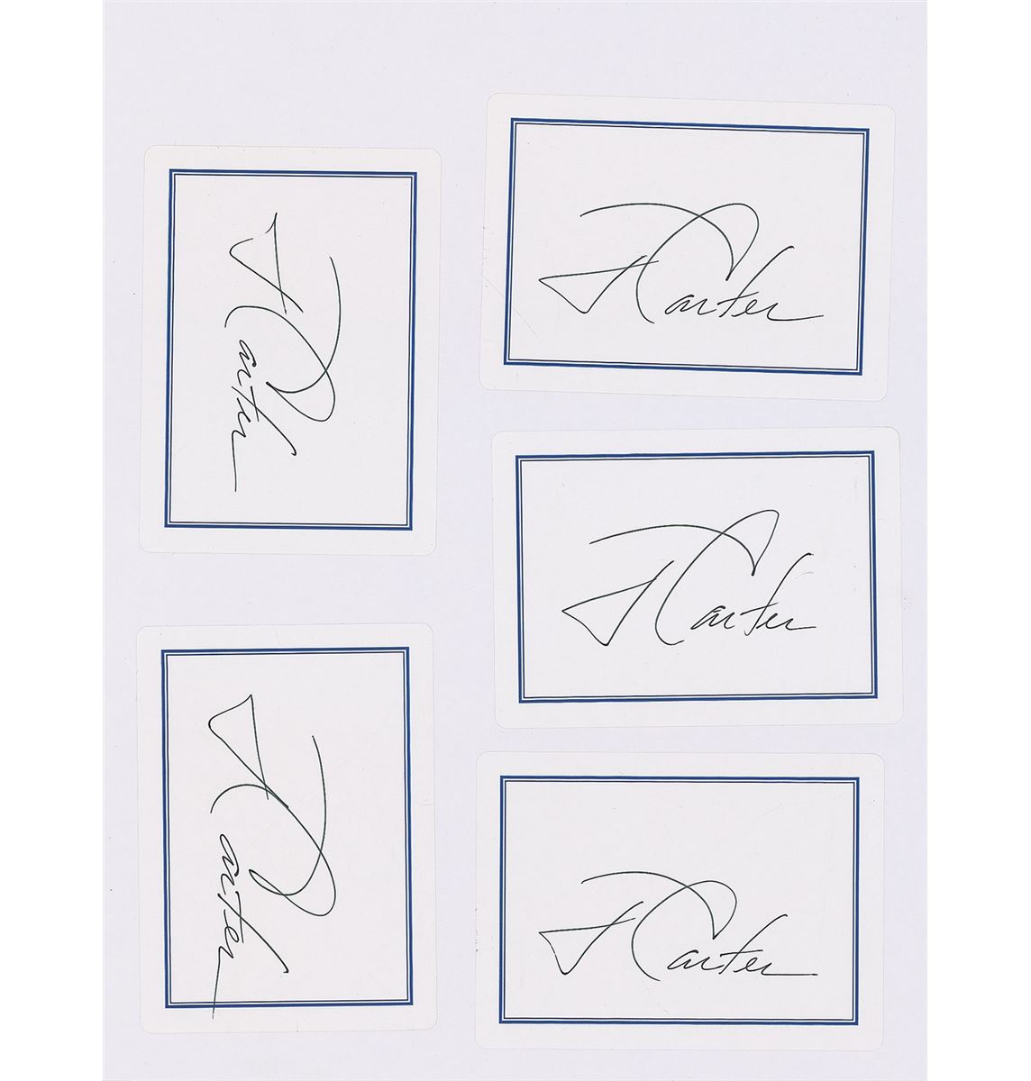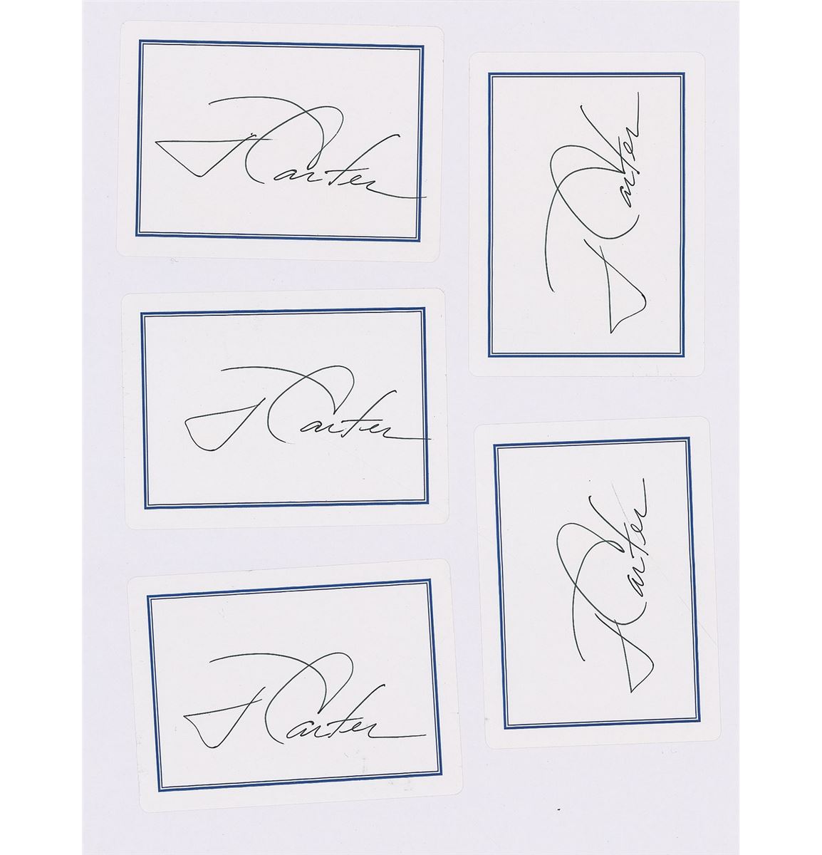 Lot of ten blue-bordered bookplates, each 4 x 3, signed in black ink, “J. Carter,” and affixed to two white 8.5 x 11 sheets. In overall fine condition.