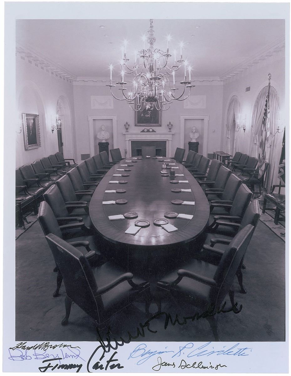 Laserprint 8.5 x 11 photo of the White House cabinet room, signed in the lower border in black felt tip by President Jimmy Carter and Vice President Walter Mondale, in black ink by Secretary of Energy James Schlesinger and Secretary of Defense Harold Brown, and in blue ballpoint by Secretary of Agriculture Bob Bergland and Attorney General Benjamin R. Civiletti. In fine condition, with moderate contrast to the Mondale signature against the dark background and a slightly grainy quality to the image.