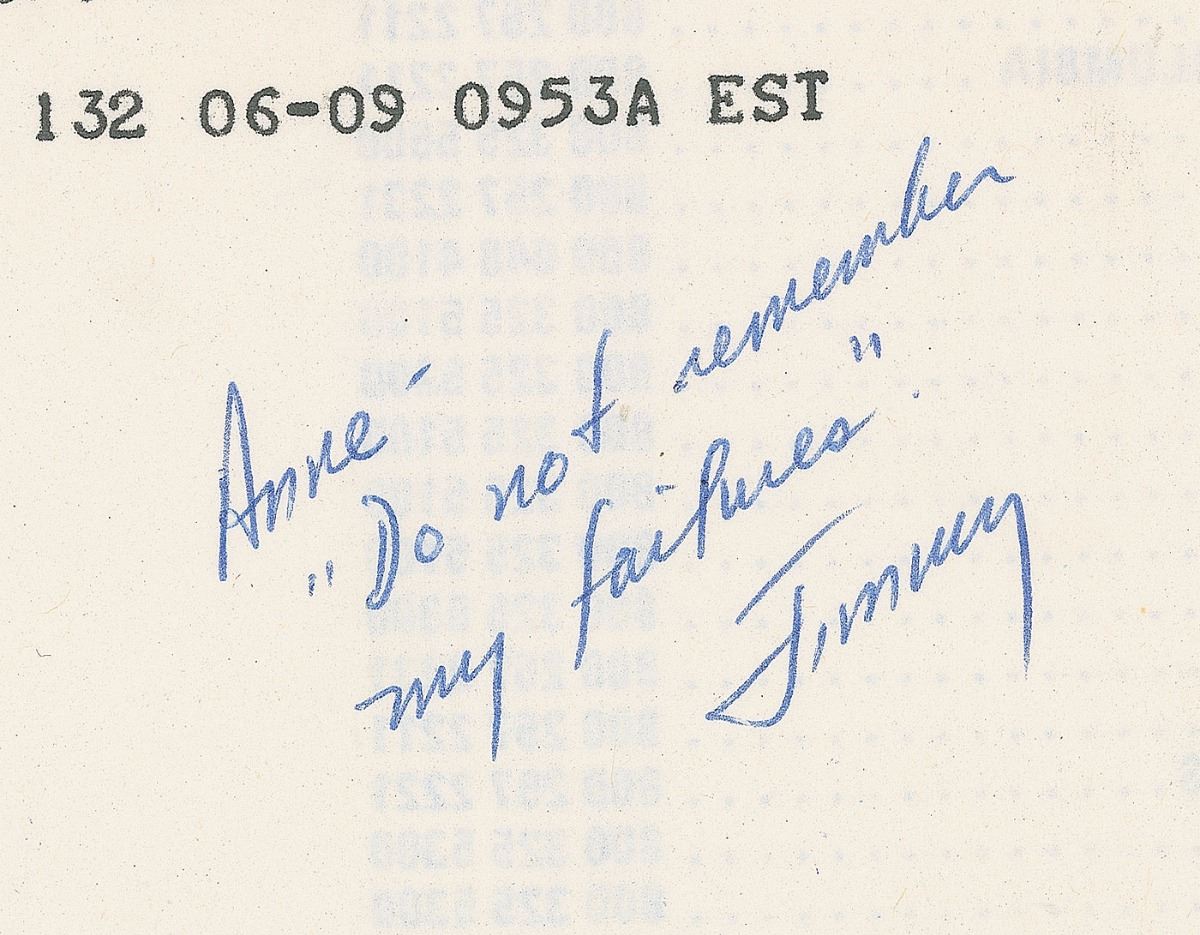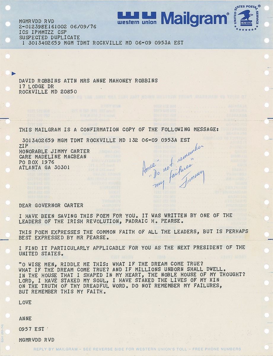 Western Union ‘mailgram’ telegram, one page, 8.5 x 11, June 9, 1976. Confirmation copy of a message sent to Carter by a supporter. In part: “I have been saving this for you. It was written by one of the leaders of the Irish Revolution, Padraic H. Pearse. This poem expresses the common faith of all leaders, but is perhaps best expressed by Mr. Pearse. I find it particularly applicable for you as the next president of the United States.” A transcript of the poem appears below. Signed and inscribed in blue ballpoint by Carter using a line from the poem, “Anne—‘Do not remember my failures,’ Jimmy.” In fine condition.