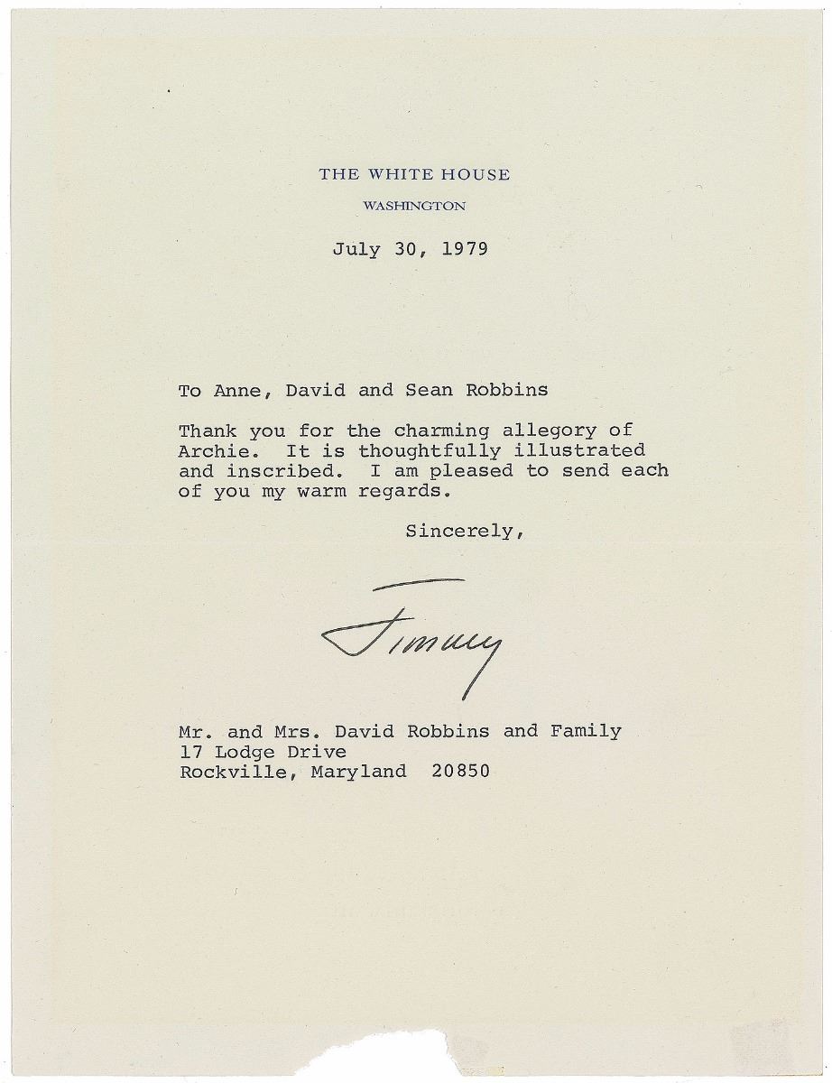 TLS as president signed “Jimmy,” one page, 6.75 x 8.75, White House letterhead, July 30, 1979. Letter to the Robbins family of Maryland. In full: “Thank you for the charming allegory of Archie. It is thoughtfully illustrated and inscribed. I am pleased to send each of you my warm regards.” In fine condition, with paper loss to bottom edge and light overall toning.