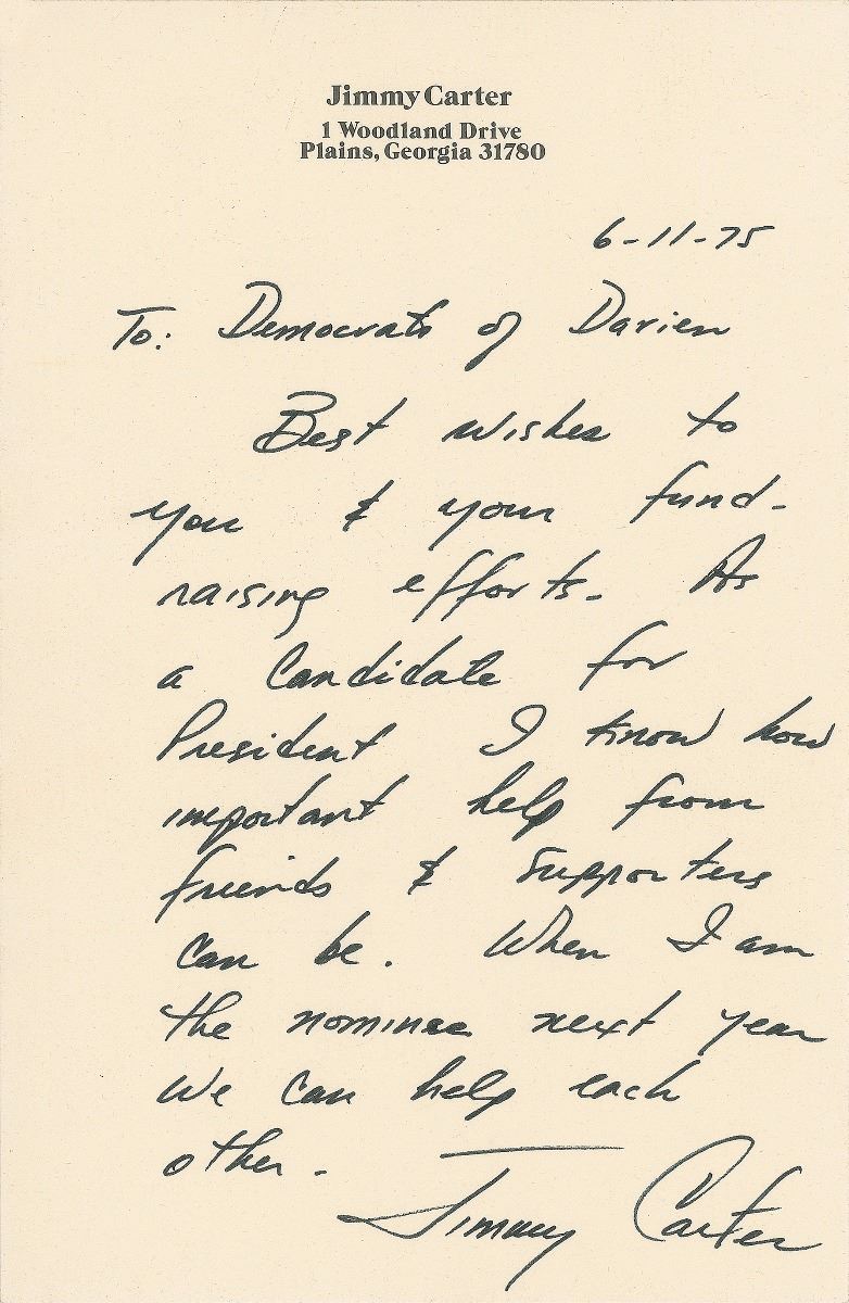 ALS, one page, 5.5 x 8.5, personal letterhead, June 11, 1975. Letter to the “Democrats of Darien,” in part: “Best wishes to you & your fundraising efforts. As a candidate for President I know how important help from friends & supporters can be. When I am the nominee next year we can help each other.” In very fine condition. This letter shows Carter’s confidence on the campaign trail and his great appreciation of early supporters. Carter is very scarce in autograph letters, especially with such excellent political content.