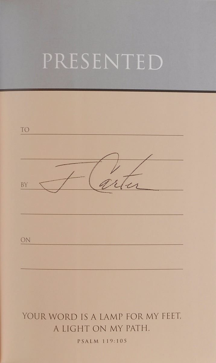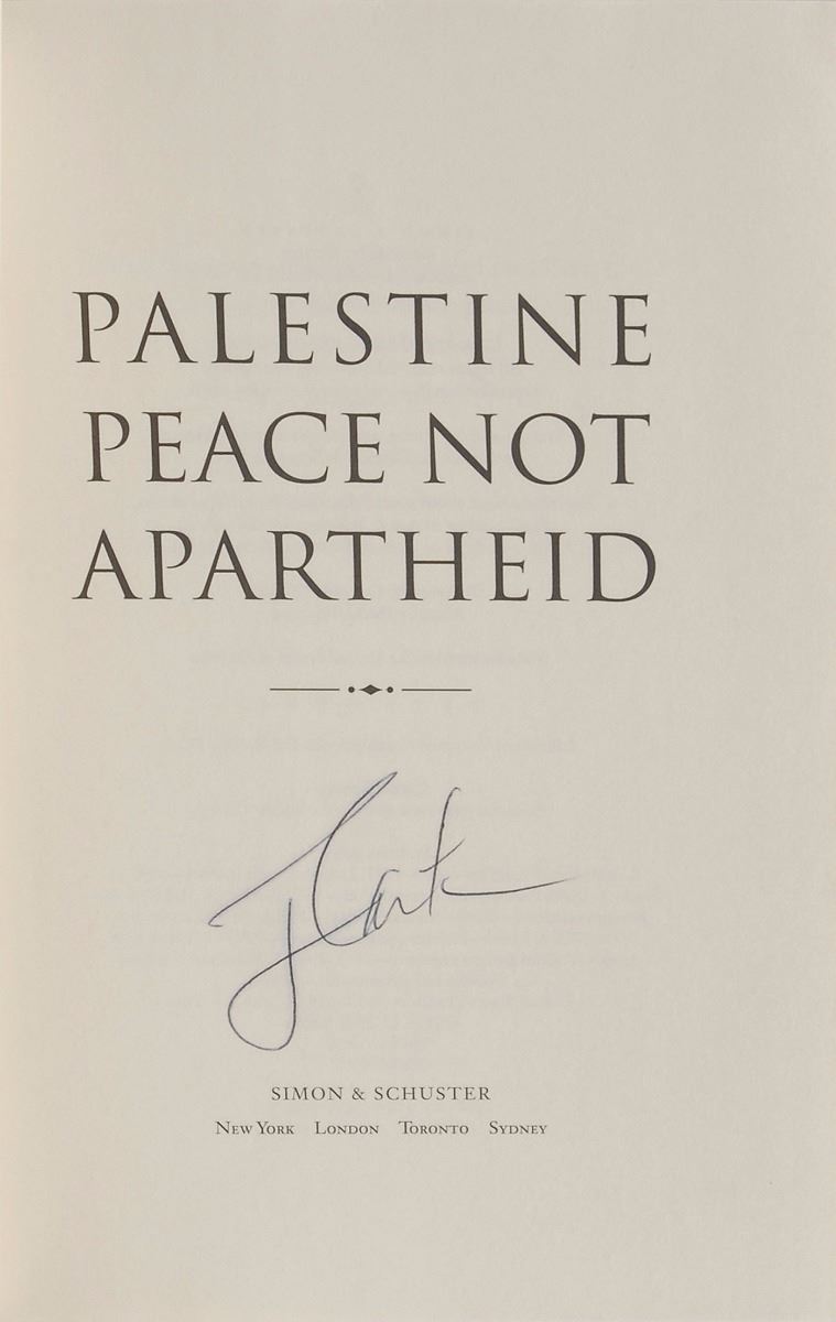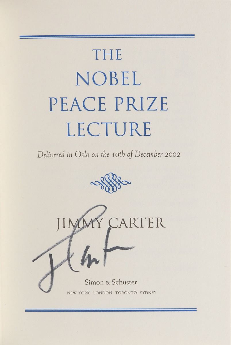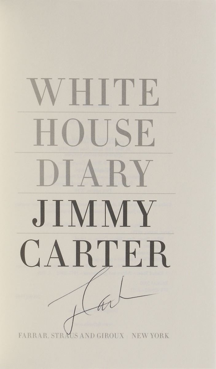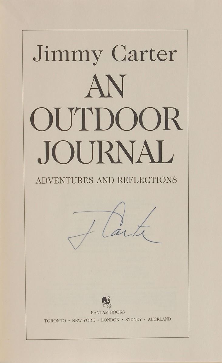 Grouping of five books, each hardcover with dust jacket, signed on the title page or presentation page in black ink, “J. Carter.” Titles include: Lessons from Life; The Nobel Peace Prize Lecture; Palestine, Peace Not Apartheid; White House Diary; and An Outdoor Journal: Adventures and Reflections. In overall fine condition.