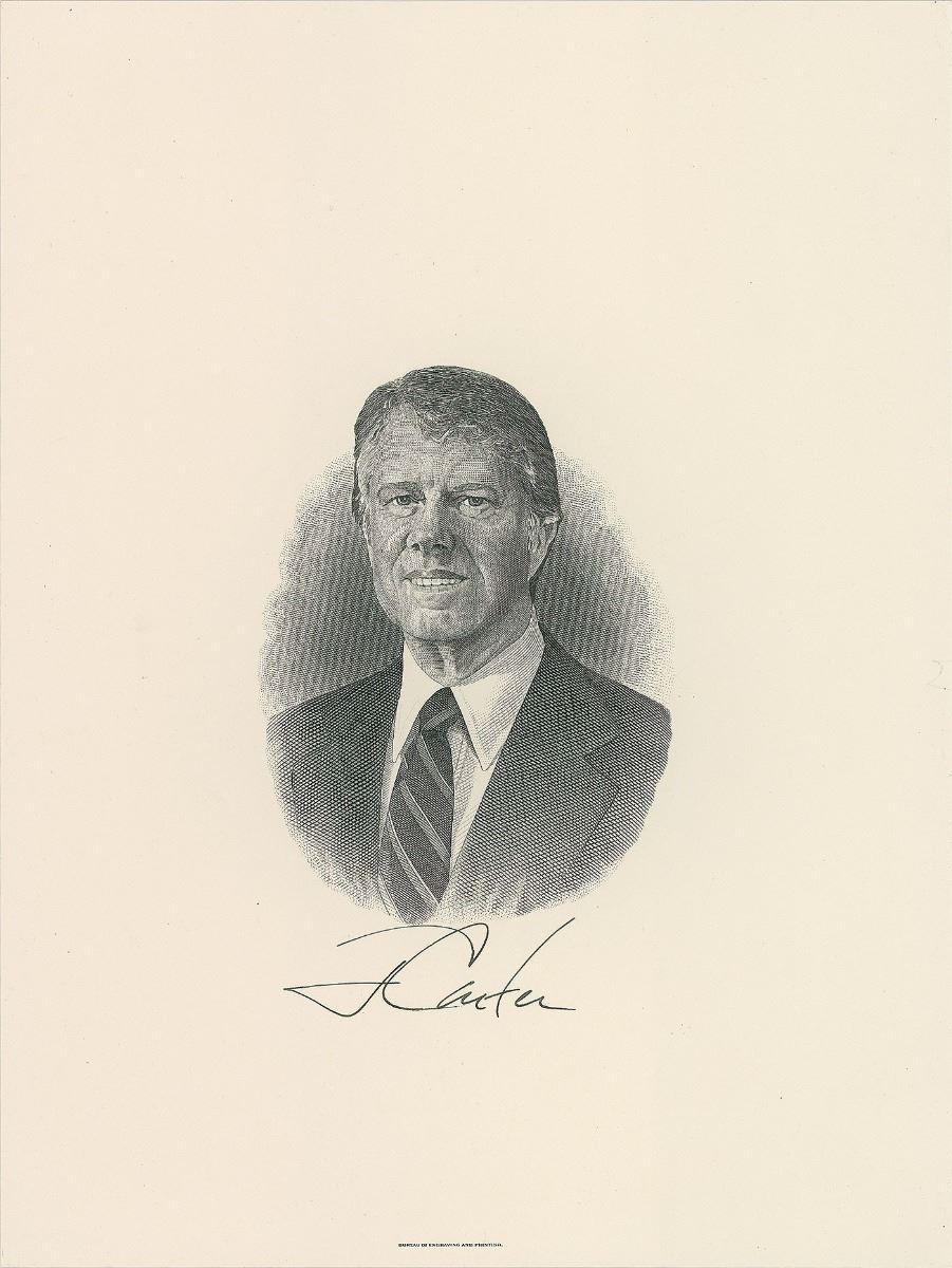 Handsome engraved portrait of President Carter by the Bureau of Engraving and Printing, 9 x 12, signed below the vignette in black felt tip, “J. Carter.” In very fine condition.