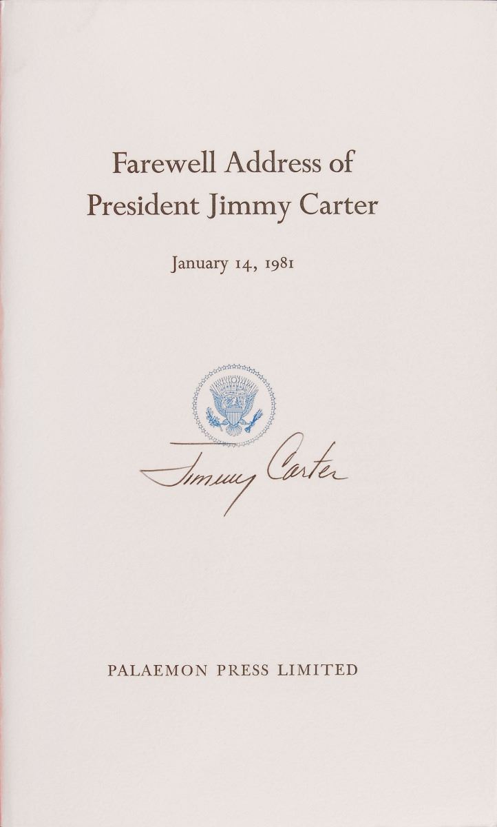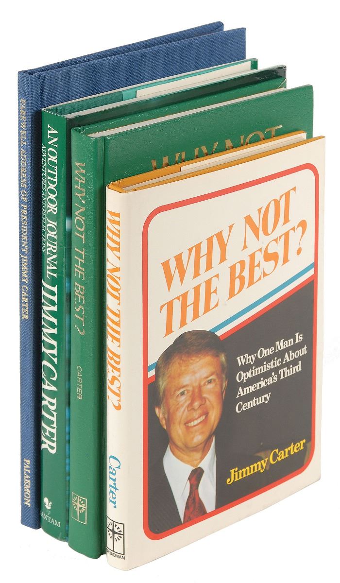 Four books, each signed “Jimmy Carter” or “J. Carter,” including: a limited first edition of the Farewell Address of President Jimmy Carter, hardcover with slipcase, numbered 65/300, signed in black ink; a presidential edition of Why Not the Best?, leather-bound hardcover, signed in black ink; a first edition of Why Not the Best, hardcover with dust jacket, signed in black ink; a first edition of An Outdoor Journal, hardcover with dust jacket, signed in blue ink. In overall fine condition.