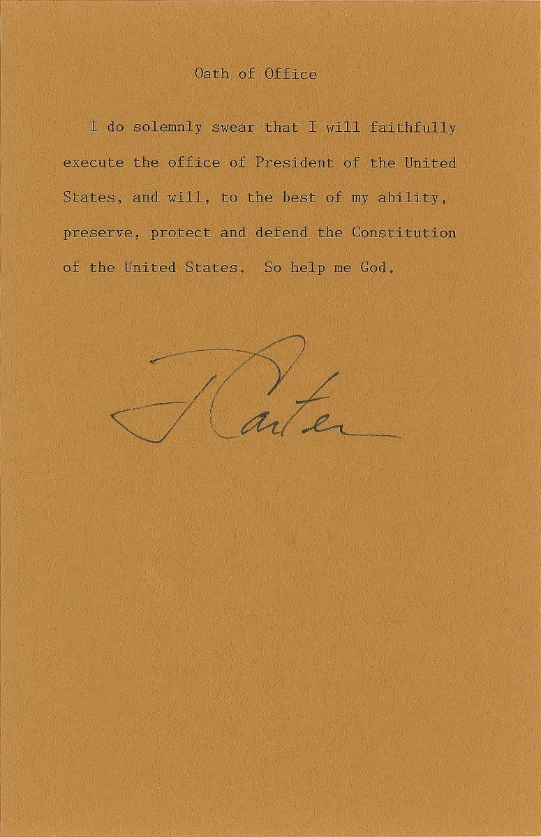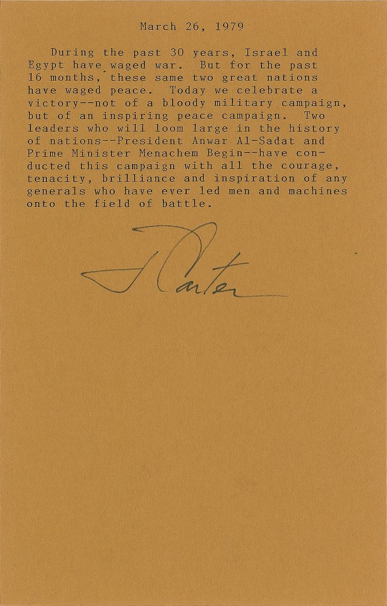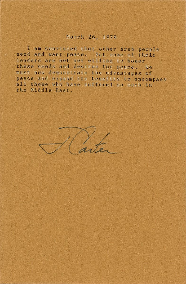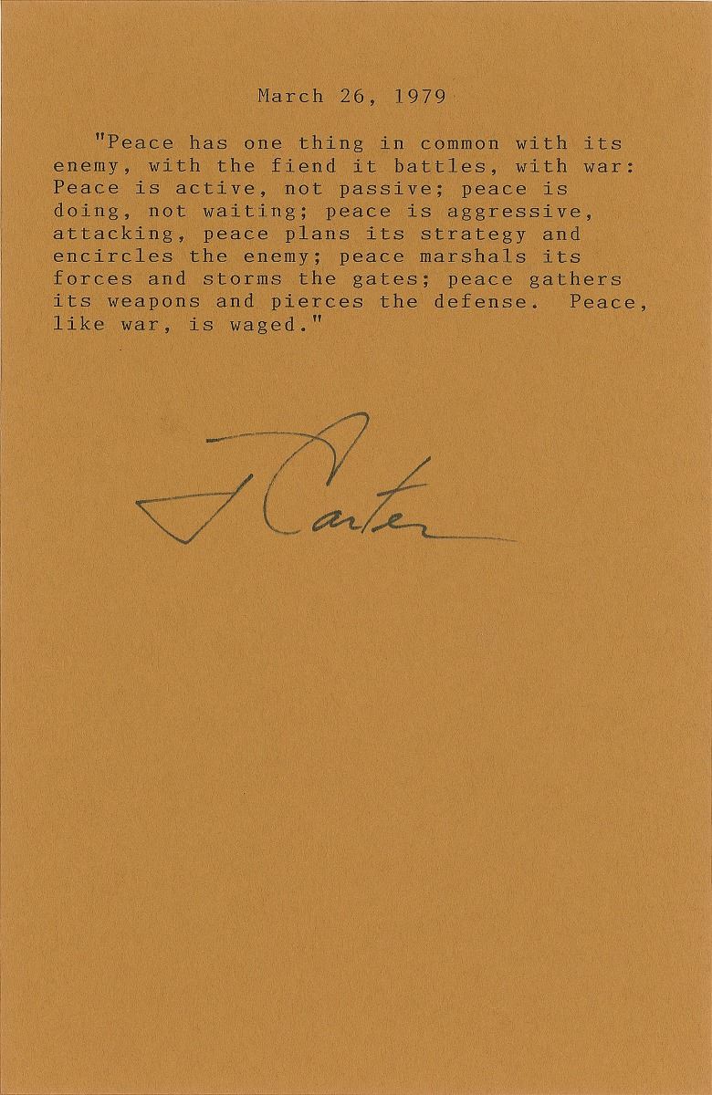 Collection of four TQSs on individual beige 5 x 8 sheets, each signed in black felt tip, “J. Carter,” including: the oath of office; and three different passages from his remarks on March 26, 1979, upon the signing of the Egypt–Israel Peace Treaty following the 1978 Camp David Accords. In overall fine condition.