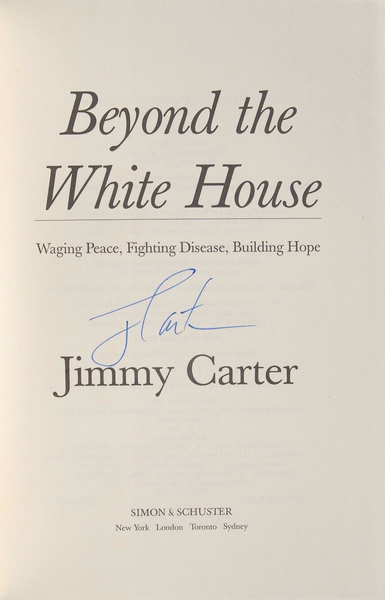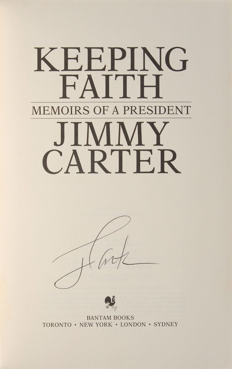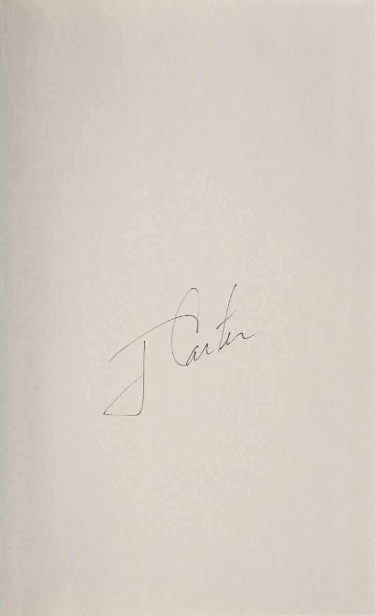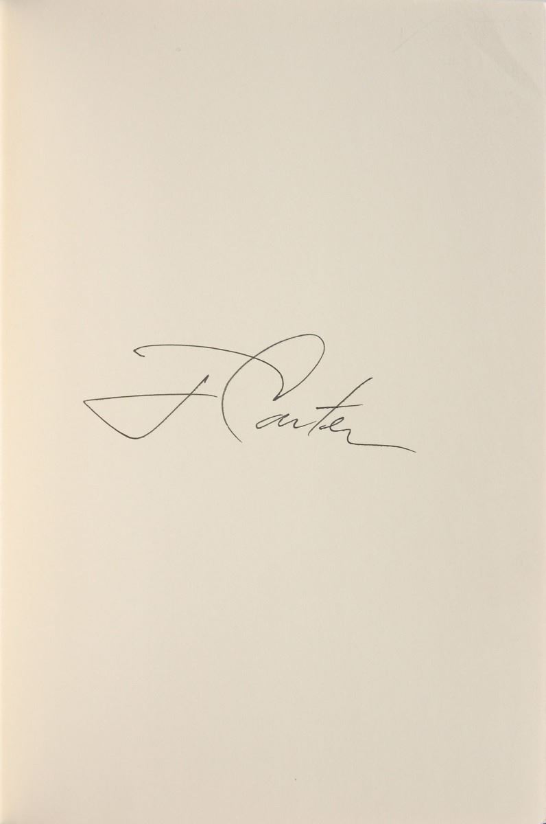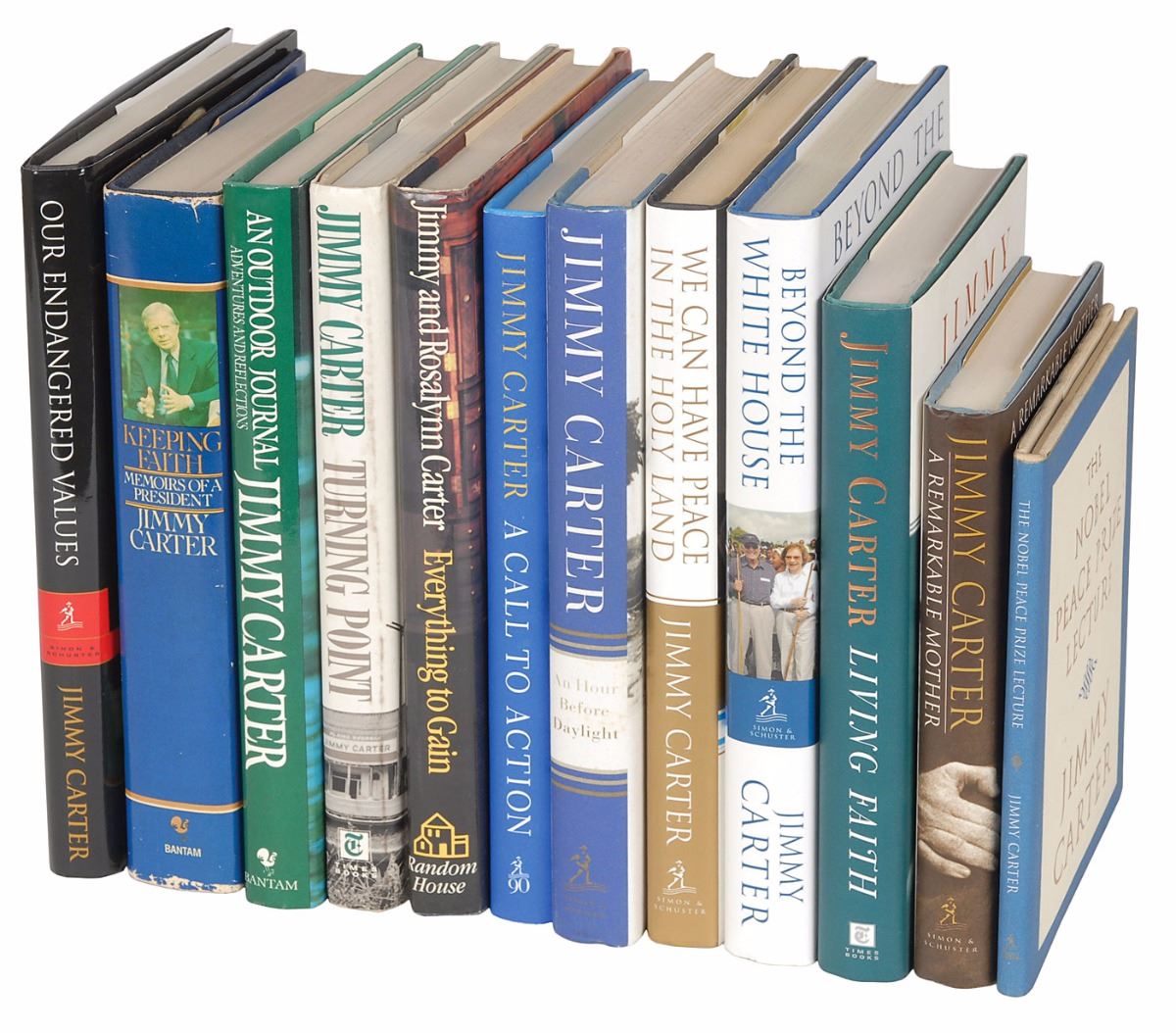 Set of twelve books, each hardcover with dust jacket, signed on an opening page in ink or felt tip, “J. Carter,” with titles including: An Hour Before Daylight; We Can Have Peace in the Holy Land; Beyond the White House; Keeping Faith; Our Endangered Values; An Outdoor Journal; A Call to Action; A Remarkable Mother; The Nobel Peace Prize Lecture; Living Faith; Turning Point; and Everything to Gain, which is signed twice by Carter and once by Rosalynn Carter. In overall fine condition.