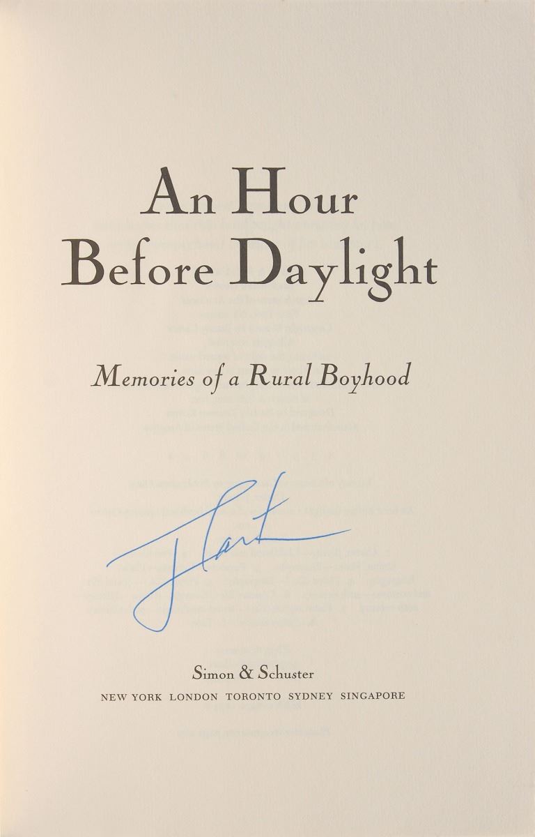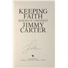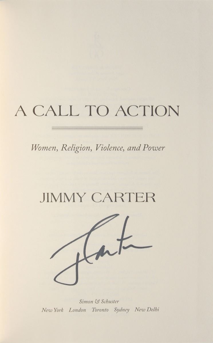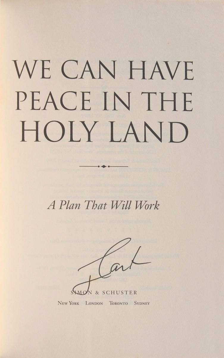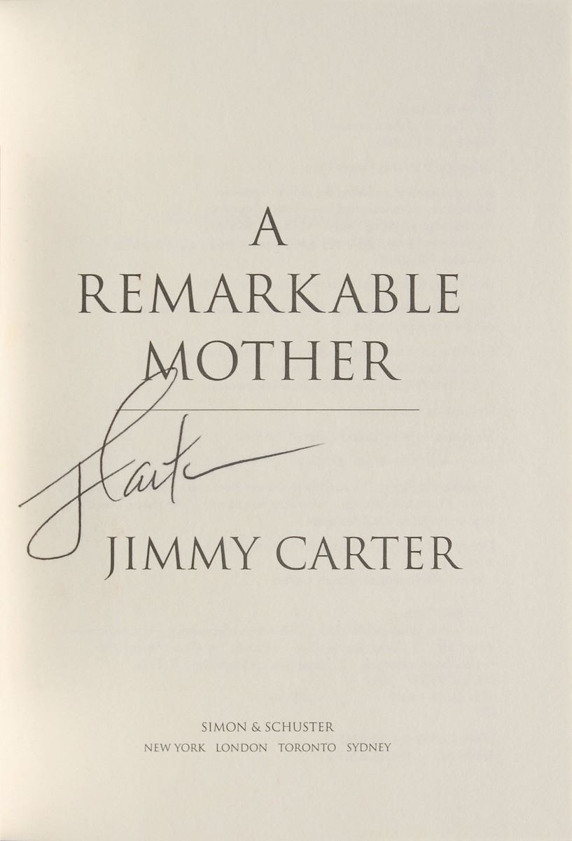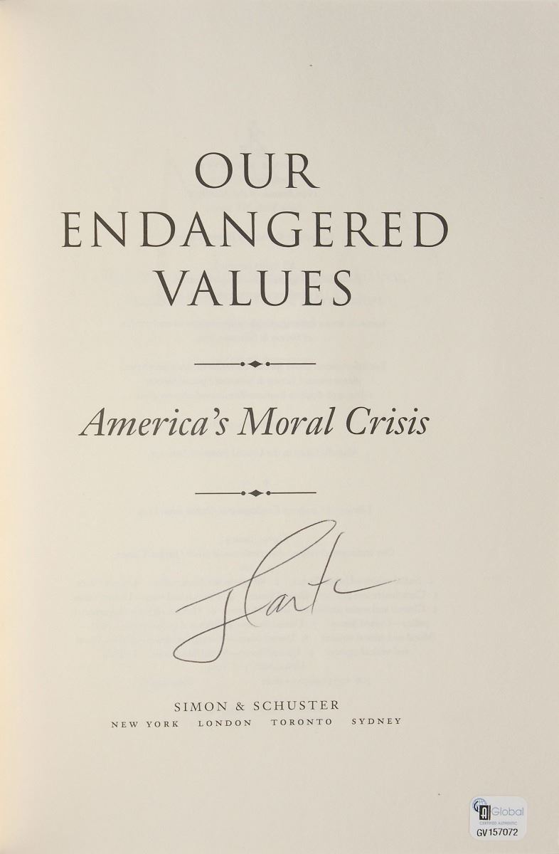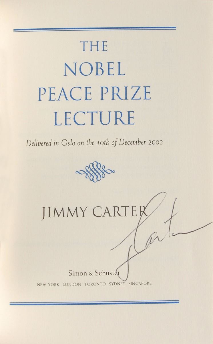 Set of twelve books, each hardcover with dust jacket, signed on an opening page in ink or felt tip, “J. Carter,” with titles including: An Hour Before Daylight; We Can Have Peace in the Holy Land; Beyond the White House; Keeping Faith; Our Endangered Values; An Outdoor Journal; A Call to Action; A Remarkable Mother; The Nobel Peace Prize Lecture; Living Faith; Turning Point; and Everything to Gain, which is signed twice by Carter and once by Rosalynn Carter. In overall fine condition.