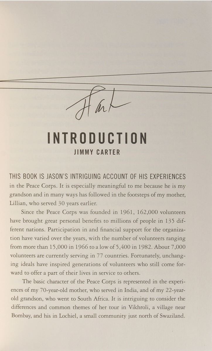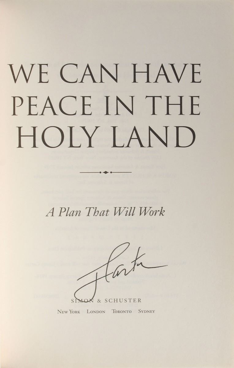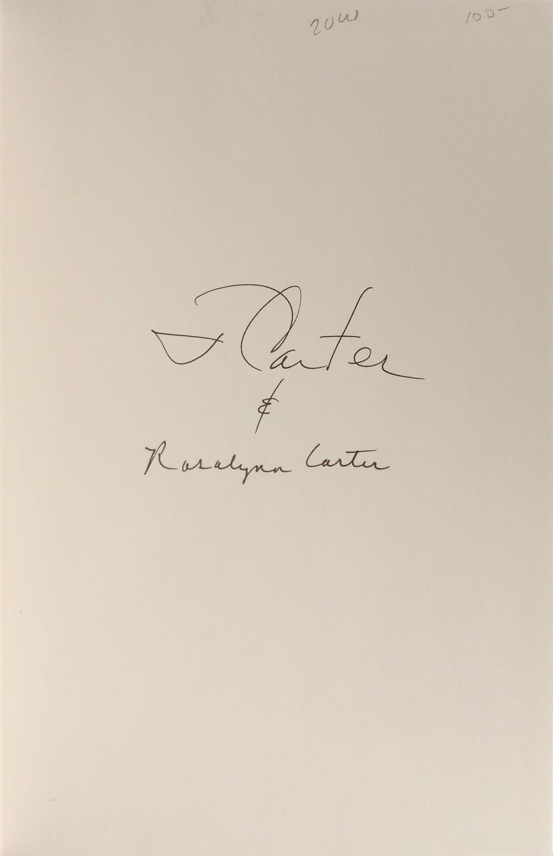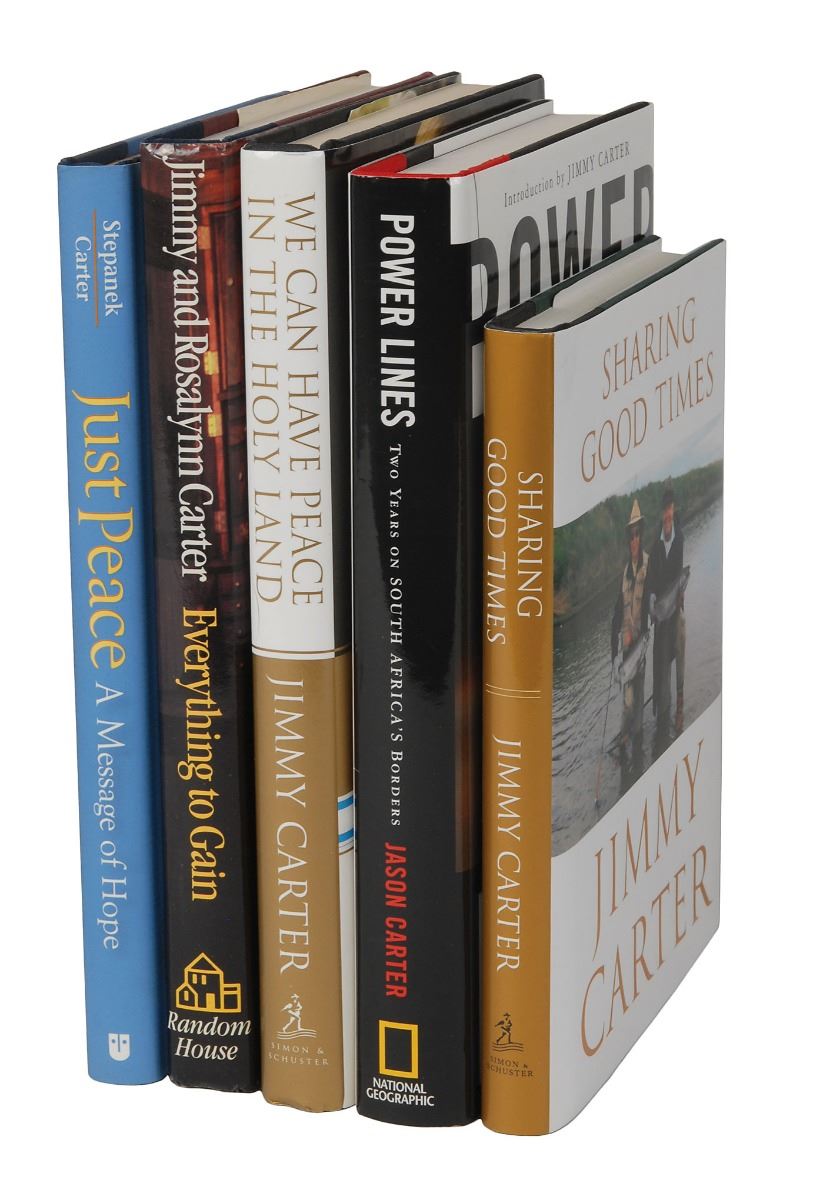Group of five books, all first editions, hardcovers with dust jackets, each signed on an opening page in ink, "J. Carter." Titles include: Everything to Gain, Just Peace, Power Lines, Sharing Good Times, and We Can Have Peace in the Holy Land. The Everything to Gain book is also signed by Rosalynn Carter. In overall fine condition.