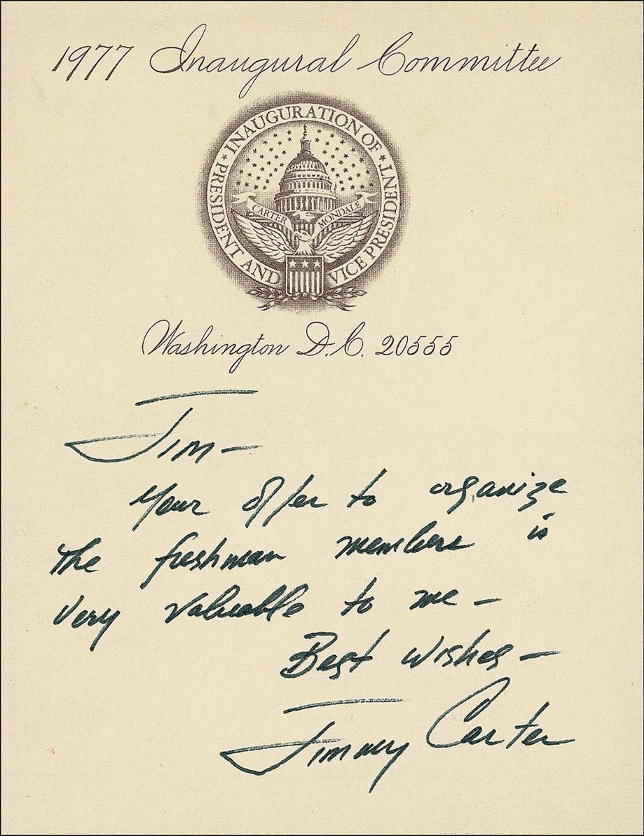 ALS, one page, 5.5 x 7.25, 1977 Inaugural Committee letterhead, no date. Letter to Jim, in full: “Your offer to organize the freshmen members is very valuable to me—.” In fine condition. Pre-certified PSA/DNA.