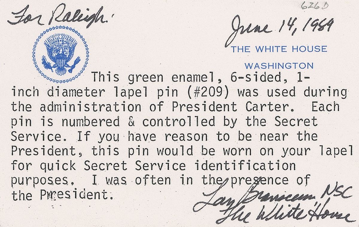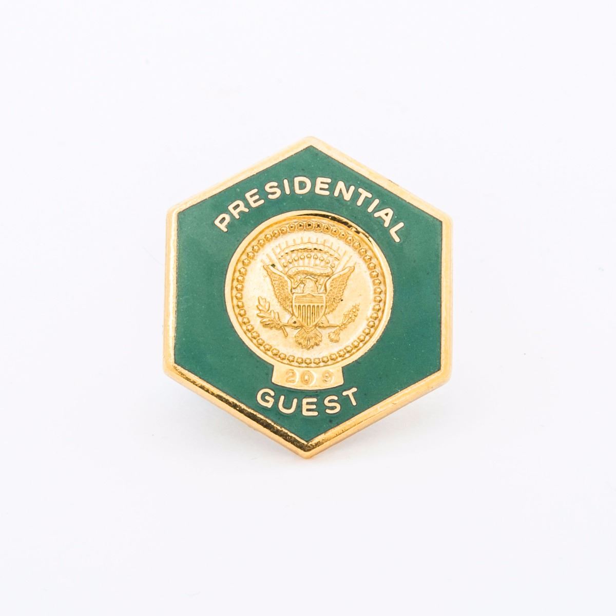 Scarce, quality manufactured Secret Service guest badge #209 issued during the administration of President Jimmy Carter, measuring 1? in diameter, featuring a raised gold presidential seal in the center surrounded by a green enamel border emblazoned with the words “Presidential Guest.” Includes a letter of provenance a White House card from NSC staffer Larry Branscum. In part: “The green enamel…lapel pin (#209) was used during the administration of President Carter. Each pin is numbered & controlled by the Secret Service. If you have reason to be near the President, this pin would be worn on your lapel for quick Secret Service identification purposes. I was often in the presence of the President.” Being a monitored item, these pins were supposed to have been collected by the secret service following a certain mission or circumstance. A prized collectible, secret service pins such as this remain nearly unobtainable to the private collector. From the Raleigh DeGeer Amyx Collection.