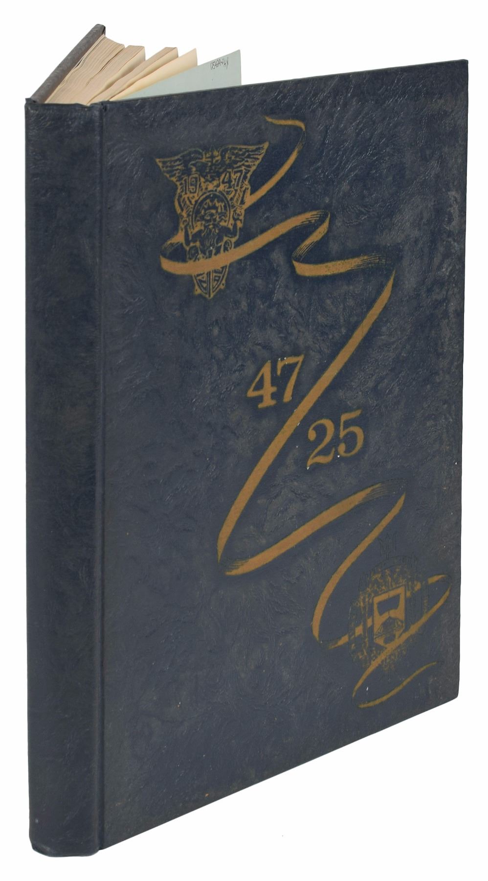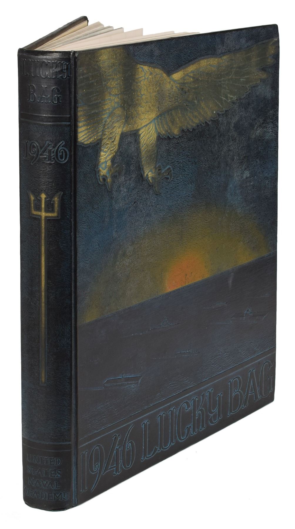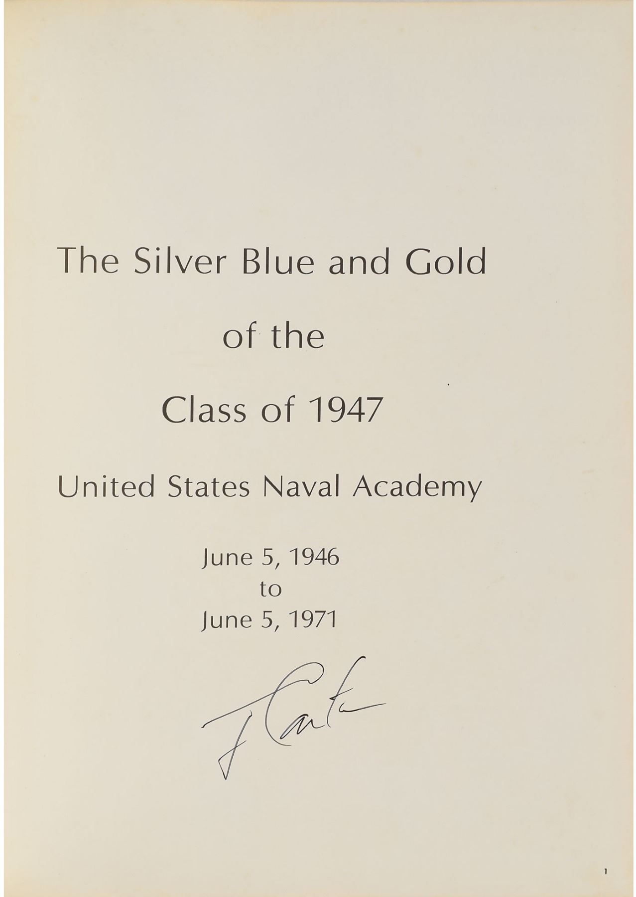 Two yearbooks: an 25th anniversary United States Naval Academy class of 1947 yearbook, leather-bound hardcover, 9.25 x 12.25, 288 pages, signed on the title page in black ink, "J. Carter," depicting Carter on page 57; and a 1946 Naval Academy Lucky Bag yearbook, leather-bound hardcover, 11.25 x 14.25, 599 pages, signed on page 441 in black ink, "J. Carter," who is depicted on the adjacent page. In overall fine condition.