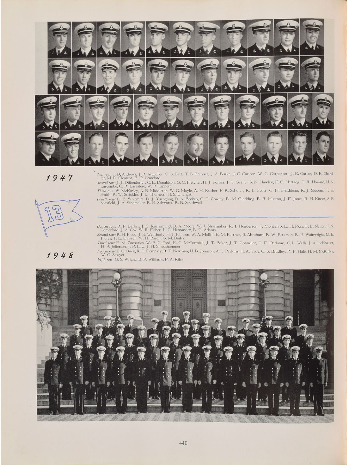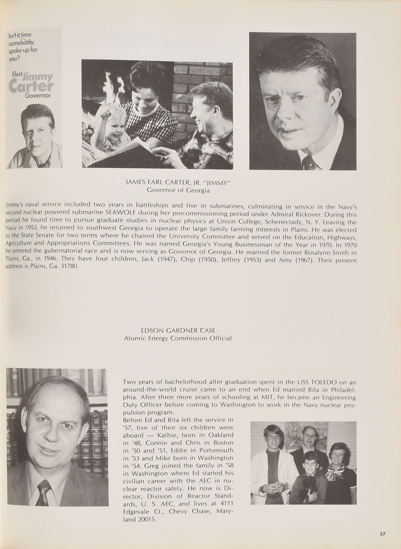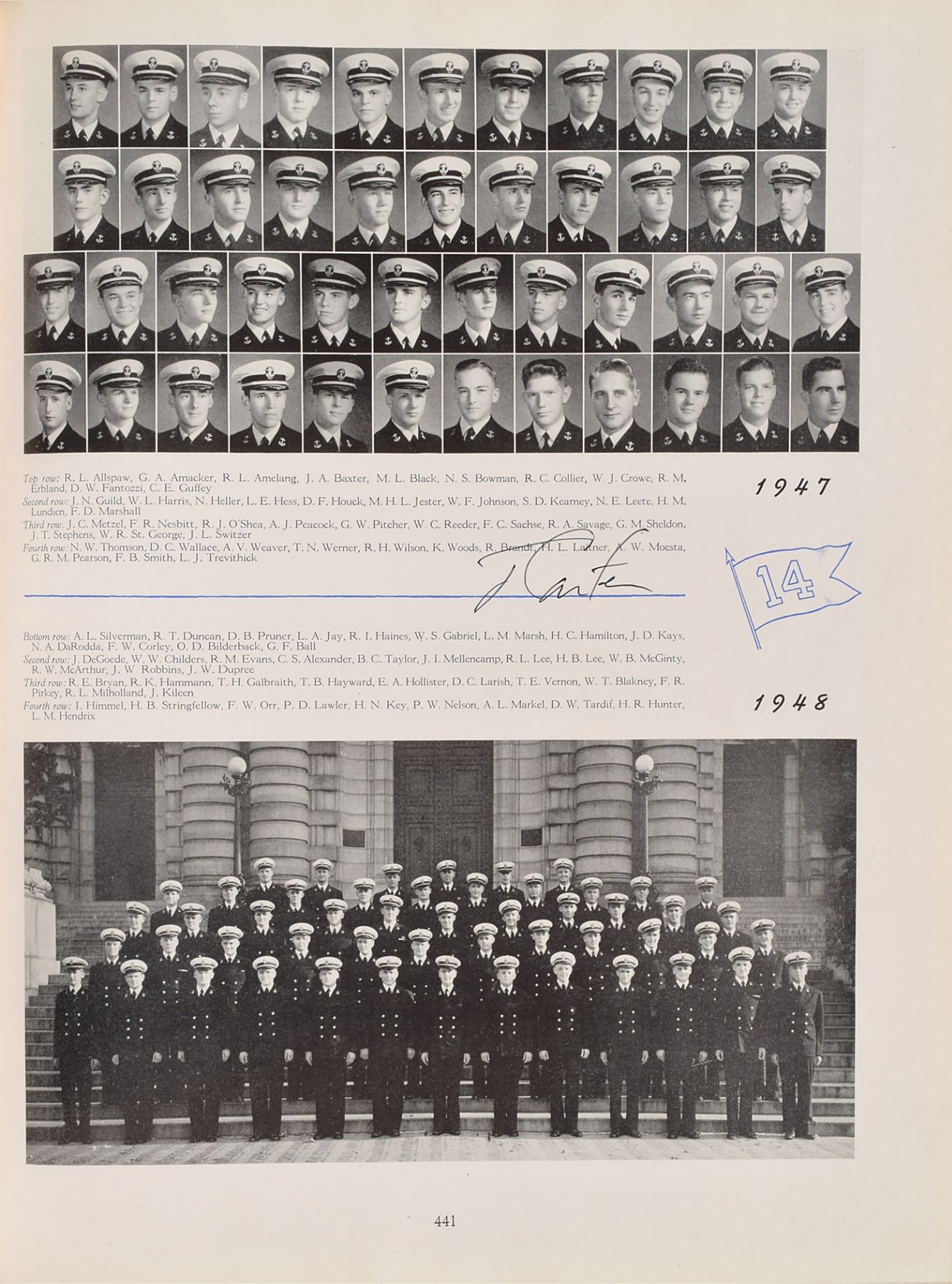 Two yearbooks: an 25th anniversary United States Naval Academy class of 1947 yearbook, leather-bound hardcover, 9.25 x 12.25, 288 pages, signed on the title page in black ink, "J. Carter," depicting Carter on page 57; and a 1946 Naval Academy Lucky Bag yearbook, leather-bound hardcover, 11.25 x 14.25, 599 pages, signed on page 441 in black ink, "J. Carter," who is depicted on the adjacent page. In overall fine condition.