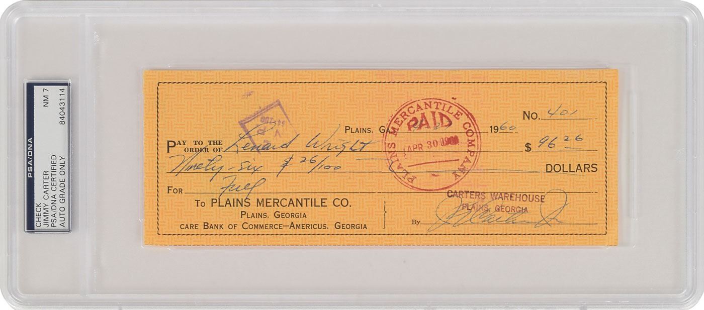 Plains Mercantile Co. check, 8.25 x 3, filled out in another hand and signed by Carter, "J. E. Carter, Jr.," payable to Leonard Wright for $96.26, April 27, 1960. Encapsulated in a plastic PSA/DNA authentication and grading holder, evaluating the autograph as "NM 7." In fine condition.