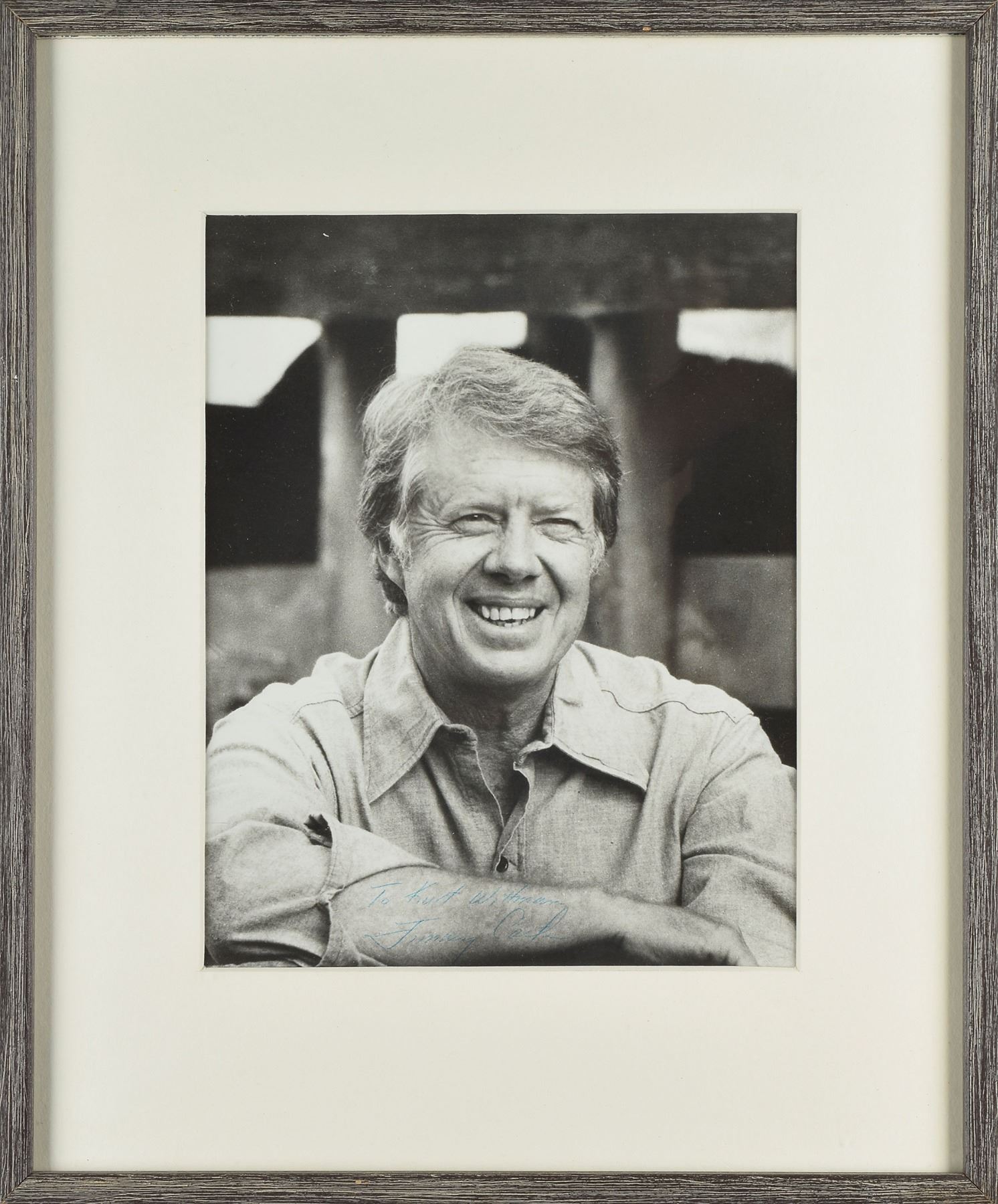 Two photos signed by Carter: a semi-glossy 7.25 x 9.25 close-up portrait, signed in blue ballpoint, "To Kurt Wittman, Jimmy Carter," matted and framed to an overall size of 12 x 14.5; and a color satin-finish 10 x 8 photo of Carter and Leonid Brezhnev during the signing of the SALT II treaty in 1979, signed in the lower border in black felt tip by Carter and two others, matted and framed to an overall size of 14.75 x 13. In overall fine condition.