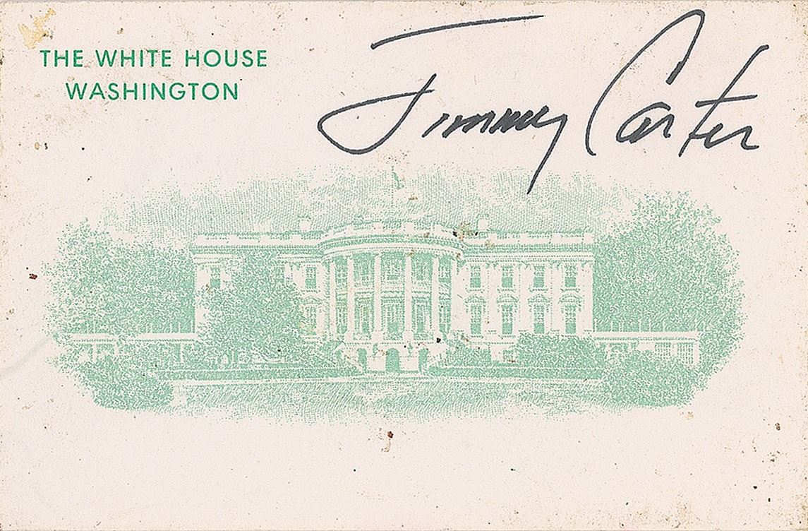 Rare White House card with green engraving of the South Portico and lawn, 3.75 x 2.5, signed in black ink by Jimmy Carter. In very good to fine condition, with scattered tiny stains. The first such official White House calling card that we have offered.