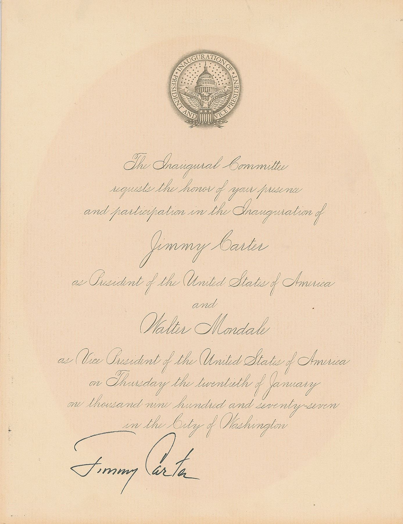Printed invitation for the inauguration of President Jimmy Carter on January 20, 1977, one page, 8.25 x 10.75, signed at the bottom in black ink by Carter. In fine condition.