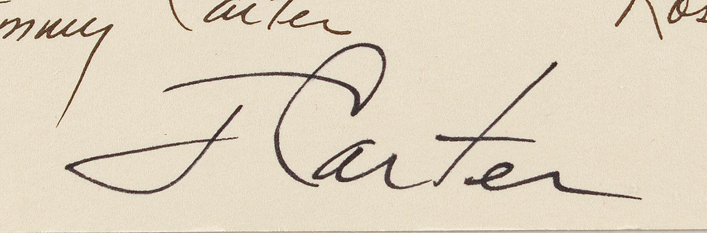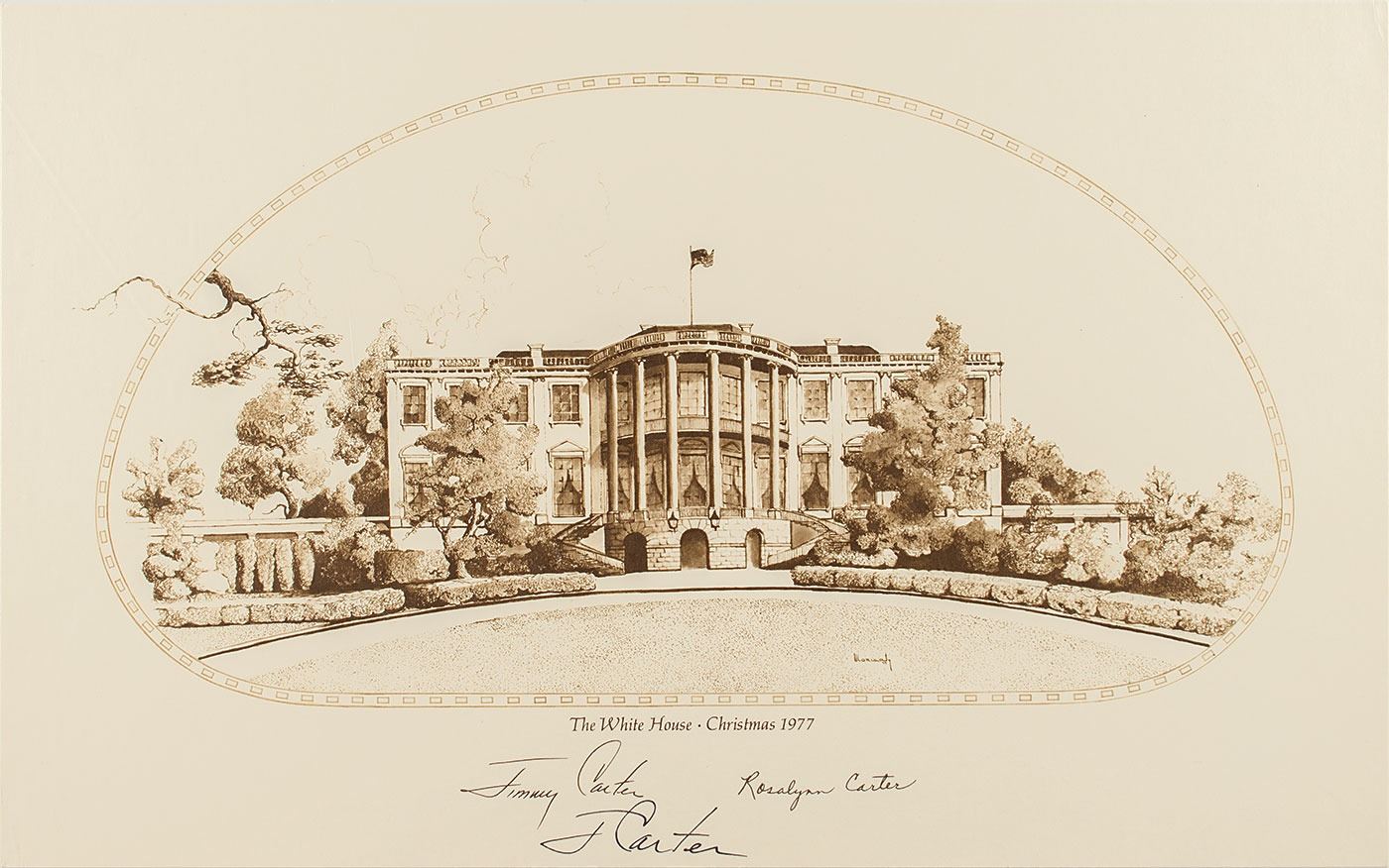 Official oversized White House Christmas card print from 1977, 16 x 10, signed at the bottom in black felt tip, "J. Carter." The card also features pre-printed facsimile signatures of President Jimmy Carter and First Lady Rosalynn Carter. In fine condition. Accompanied by the original transmittal envelope.