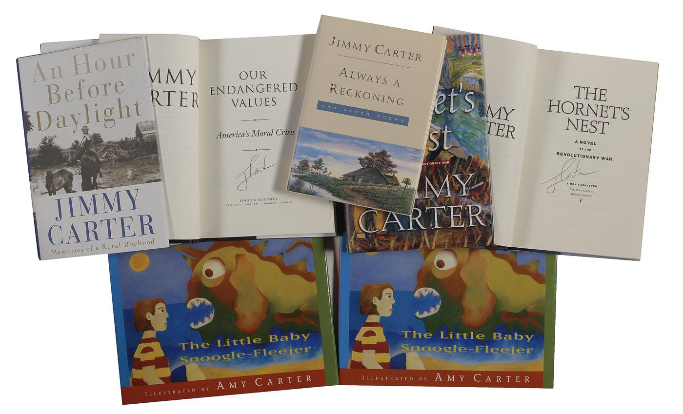 Seven hardcover books, An Hour Before Daylight, Our Endangered Values, two copies of The Hornet’s Nest, each signed on the title page, “J. Carter”; and Always a Reckoning and two copies of The Little Baby Snoogle-Fleejer, each signed on a bookplate, with Amy Carter also signing two of the bookplates. In fine condition. Oversized. RRAuction COA.