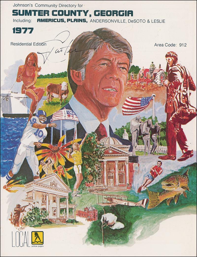 Two 1977 Sumter County, Georgia telephone directories individually signed on the front cover in black felt tip, “J. Carter.” In fine condition, with a trivial tear near the head of the spine of each volume, a few faint surface impressions, and a couple of letters light but legible. RRAuction COA.