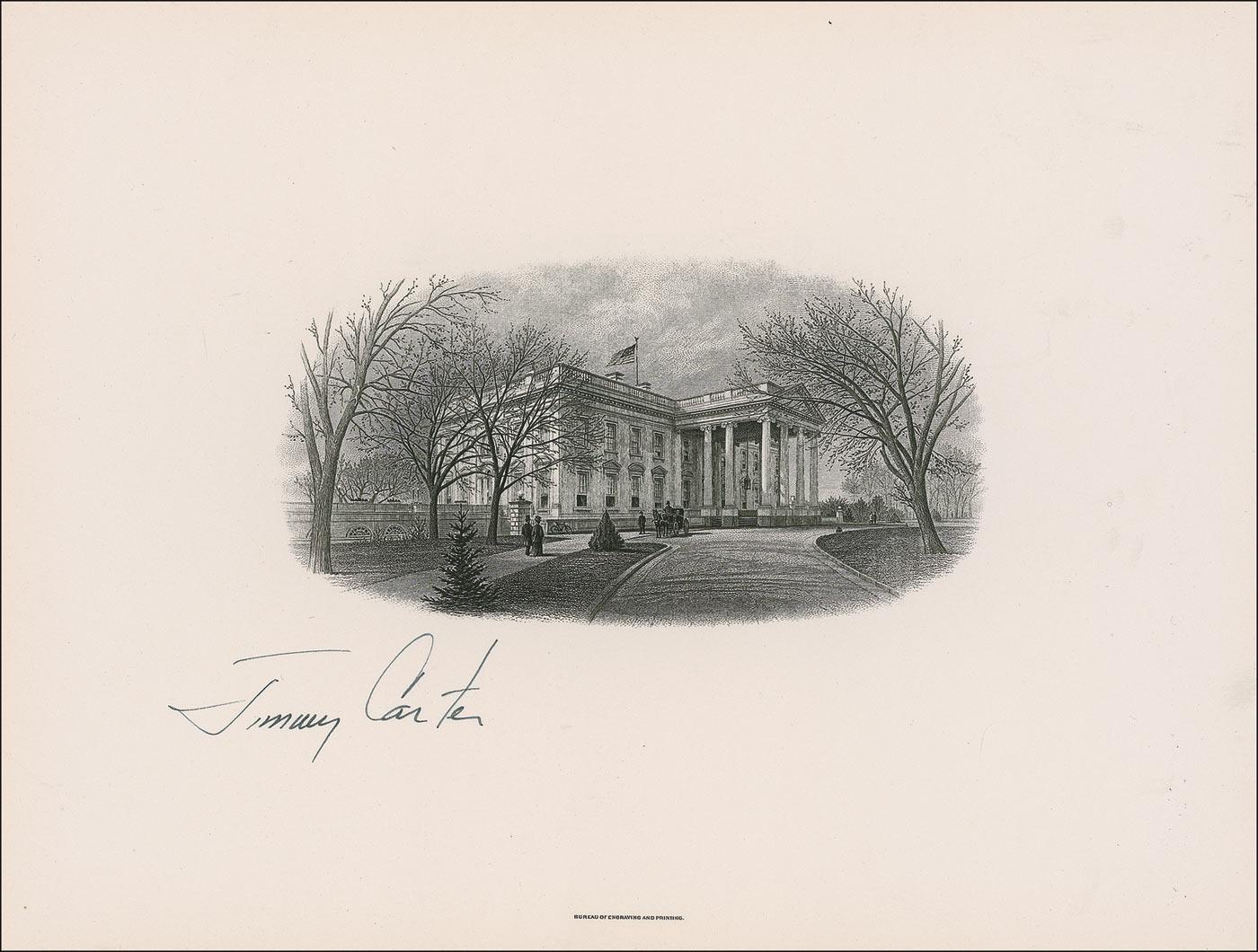 Very nice engraved portrait of the exterior of the White House by the Bureau of Engraving and Printing, 8 x 6, signed under the image in black ink. In very fine condition. RRAuction COA.