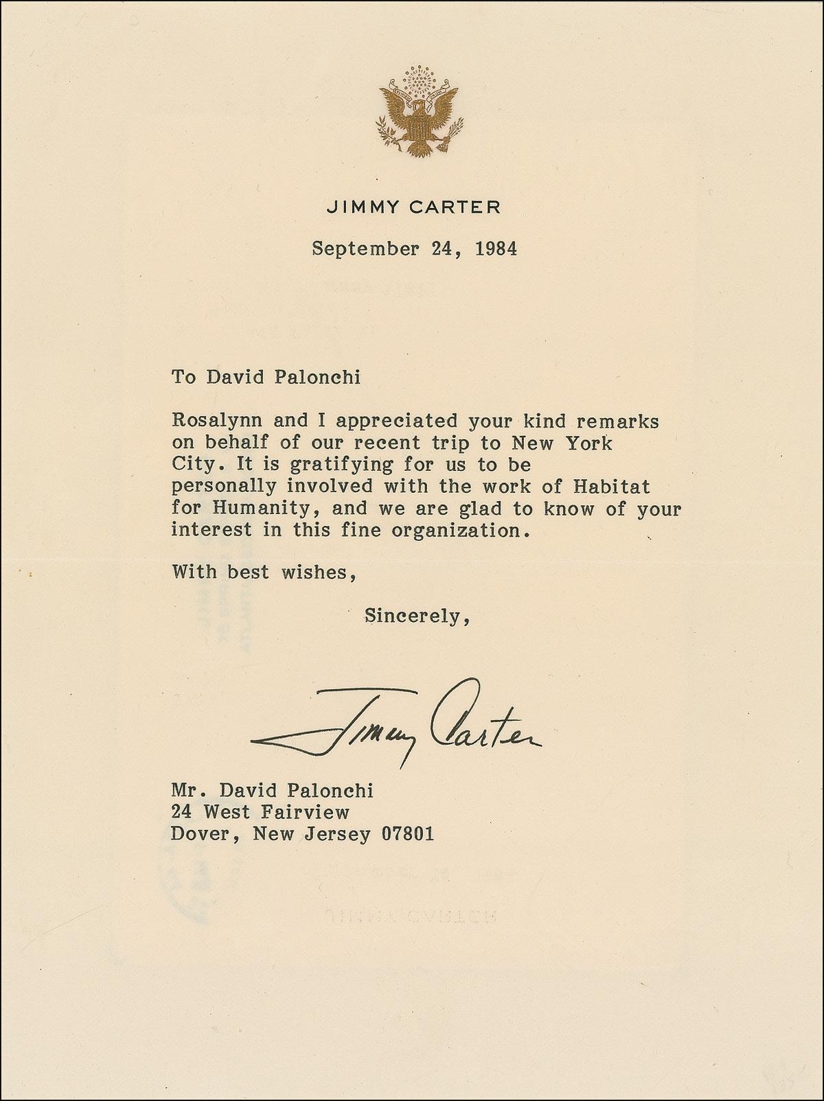 TLS, one page, 6.5 x 8.5, personal letterhead, September 24, 1984. Letter of gratitude to a Habitat for Humanity supporter. In full: “Rosalynn and I appreciated your kind remarks on behalf of our recent trip to New York City. It is gratifying for us to be personally involved with the work of Habitat for Humanity, and we are glad to know of your interest in this fine organization.” Letter is archivally sleeved in acid-free Mylar, along with the original mailing envelope. In very fine condition. Pre-certified PSA/DNA and RRAuction COA.