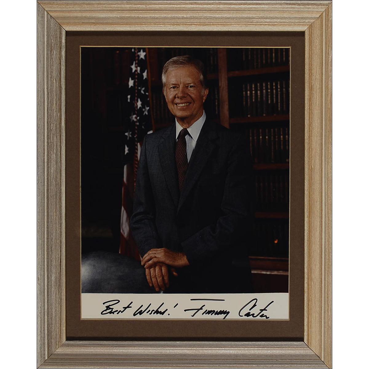 Color satin-finish 7.5 x 9.75 photo, signed in the lower border in black felt tip, “Best wishes! Jimmy Carter.” Matted and framed to an overall size of 10.5 x 13. In fine condition.