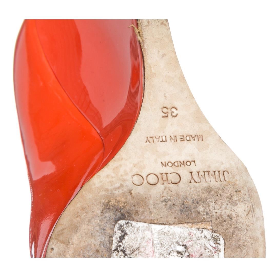 Jimmy Choo orange patent leather open toe wedges 35. Item is pre-owned.