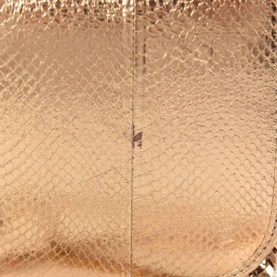 Gold mini satchel is crafted of metallic snake skin. The bag features a lengthy leather cross body strap with a gold adjustment buckle and a cross over flap and strap with a gold press lock. This opens to a camel microfiber interior.