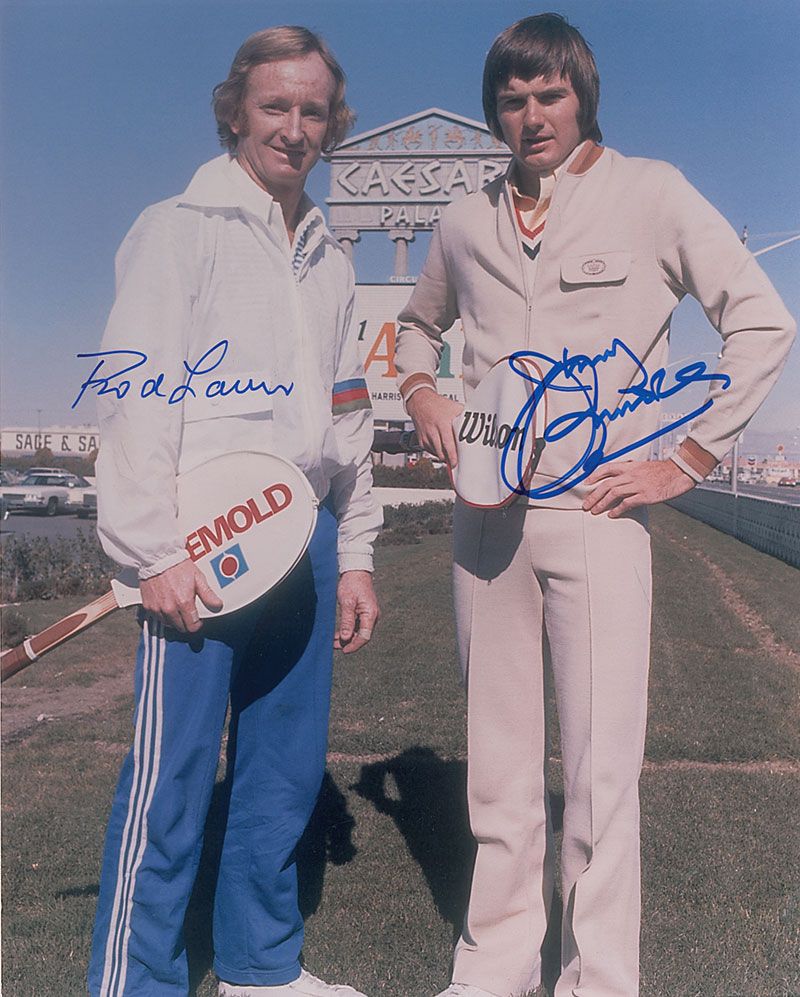 Color glossy 8 x 10 photo of the tennis greats out in front of Caesar’s Palace, signed in blue felt tip by Connors and Laver. In very fine condition.