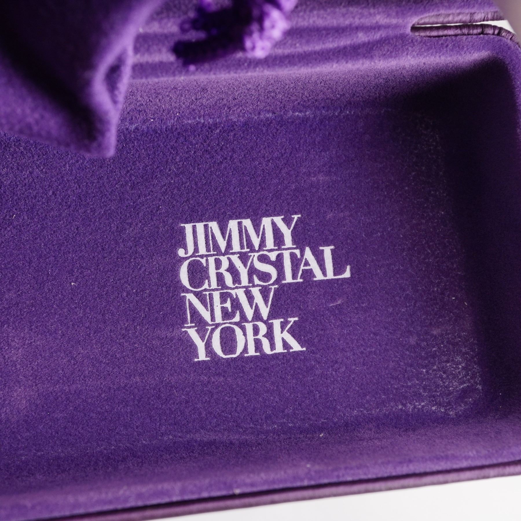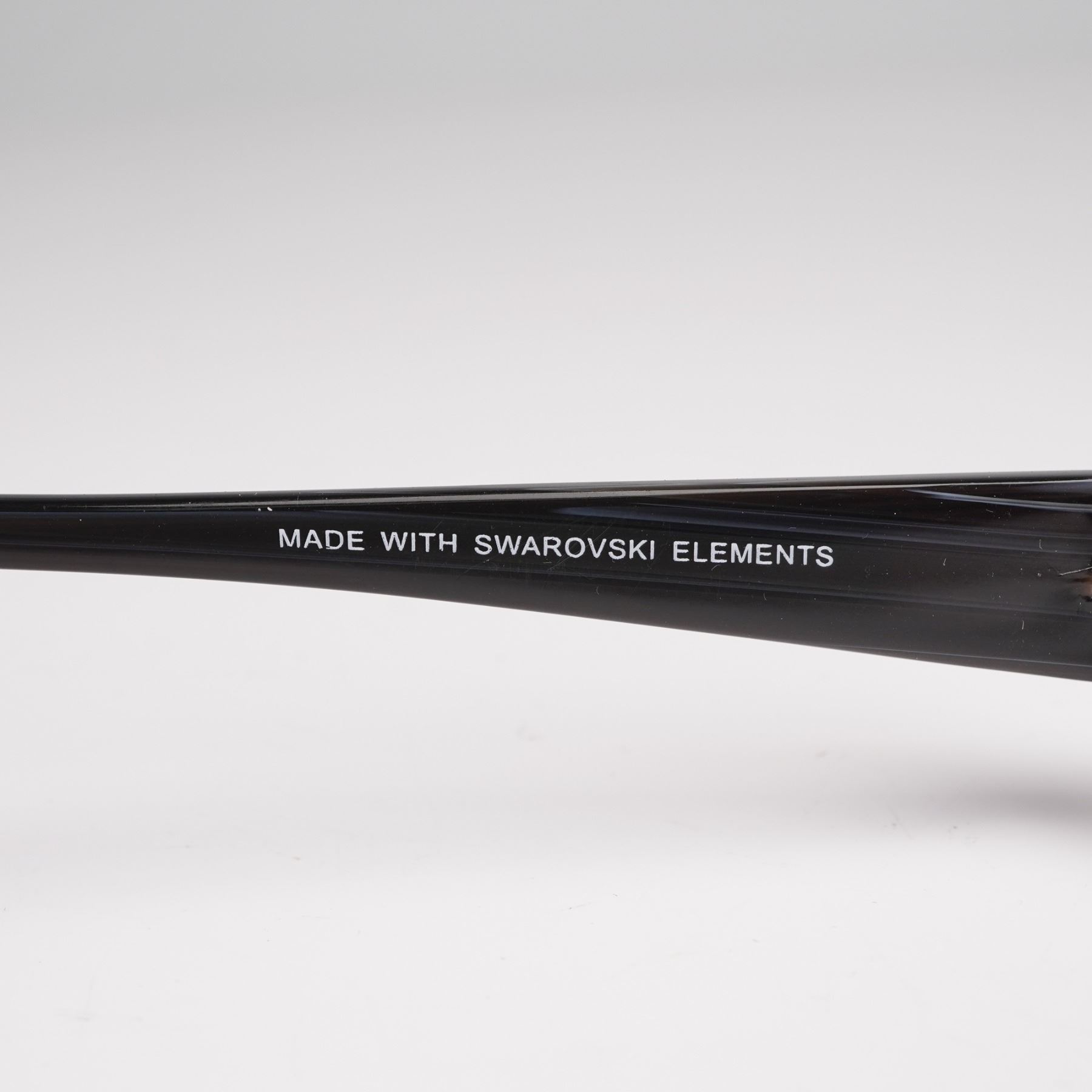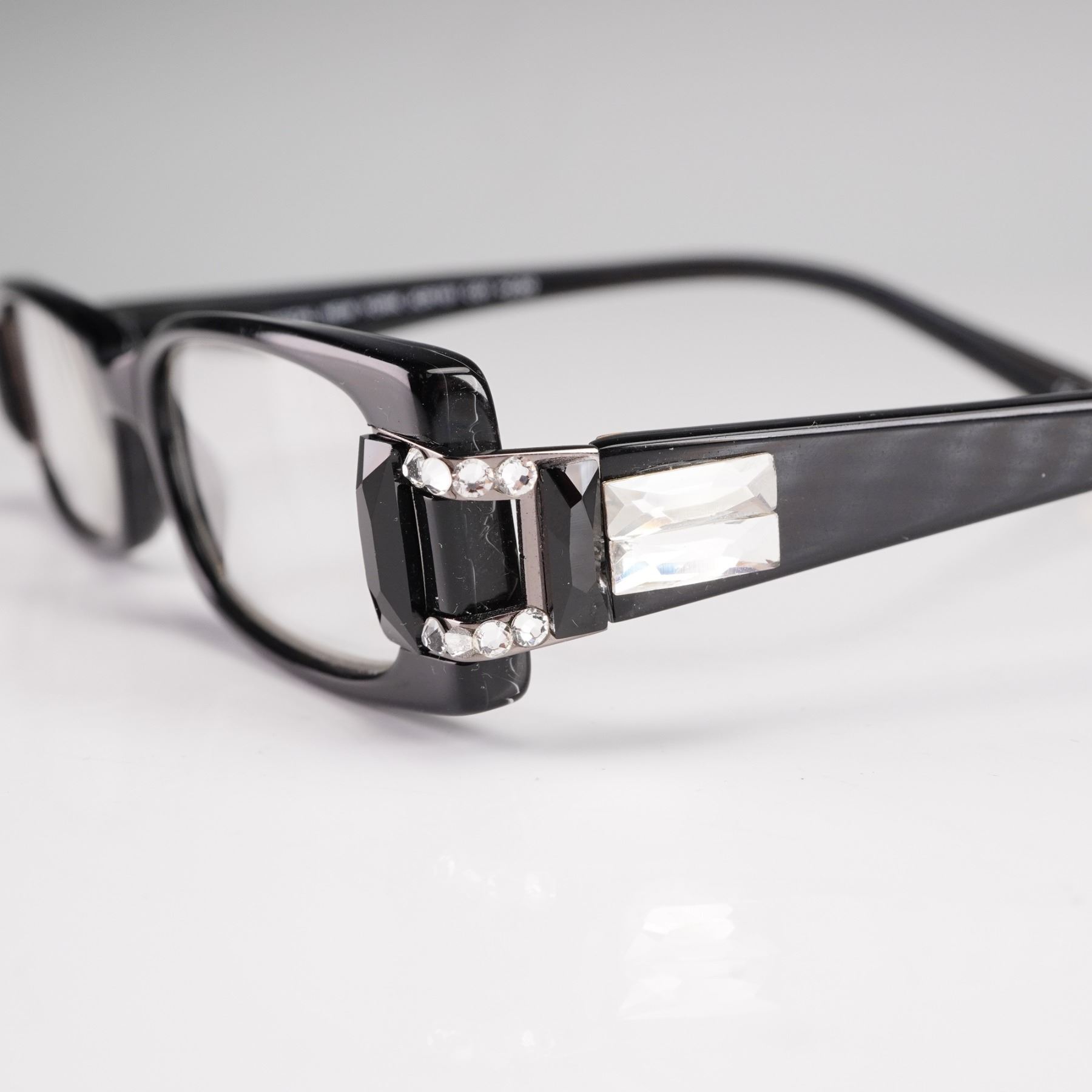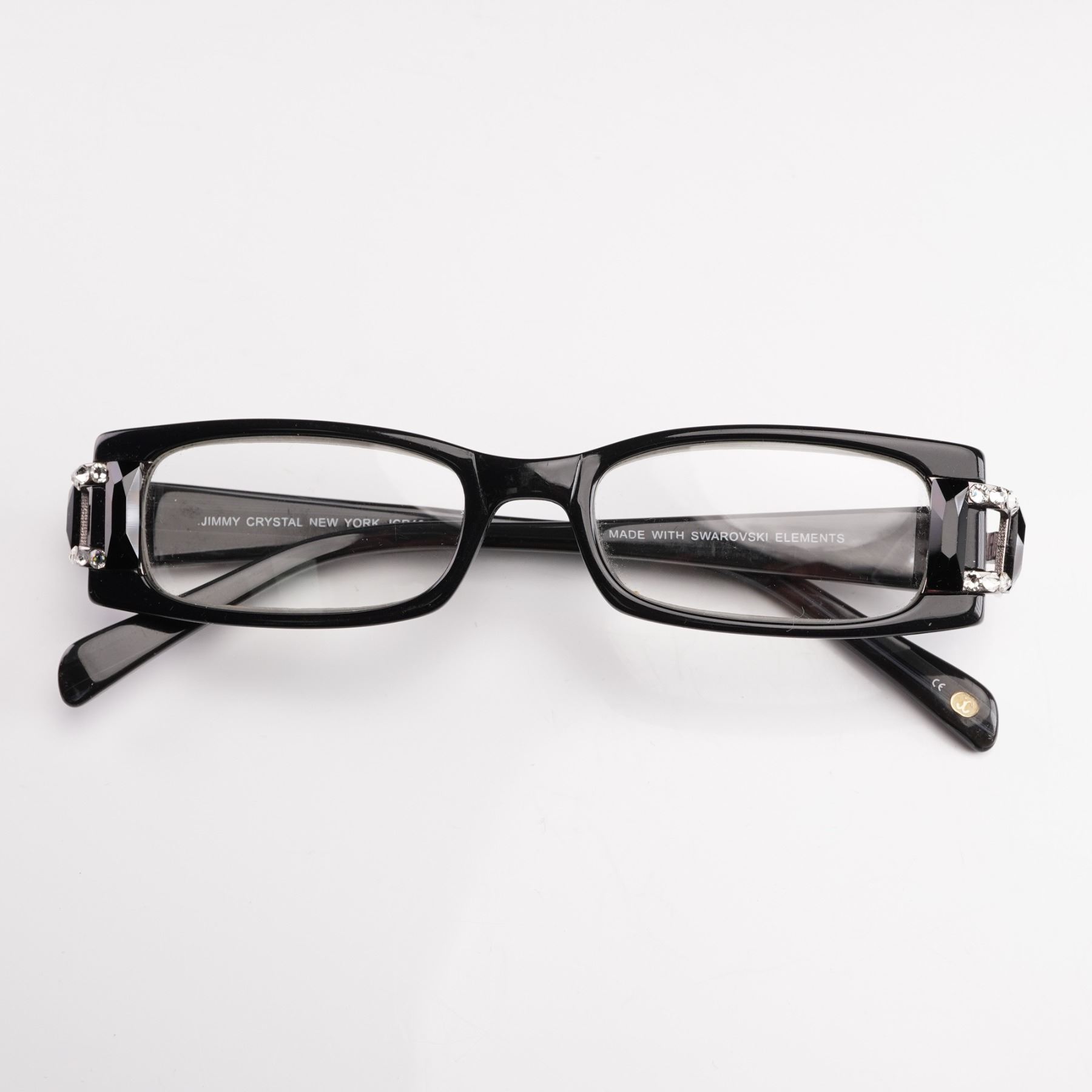 These luxurious reading glasses from Jimmy Crystal New York exemplify opulence and design flair, featuring dazzling Swarovski Elements embedded along the temples and hinge details. The glossy black rectangular frames offer a sleek and bold silhouette, accentuated by large crystal embellishments that capture and reflect light. Model JCR181 C01 is crafted with a +2.00 magnification strength and showcases signature branding along the inner arms, reading "MADE WITH SWAROVSKI ELEMENTS" and "JIMMY CRYSTAL NEW YORK." Includes the original plush purple case bearing the Jimmy Crystal New York logo plaque. Glasses approximately 1"H; box approximately 2.5"W x 6"L.
