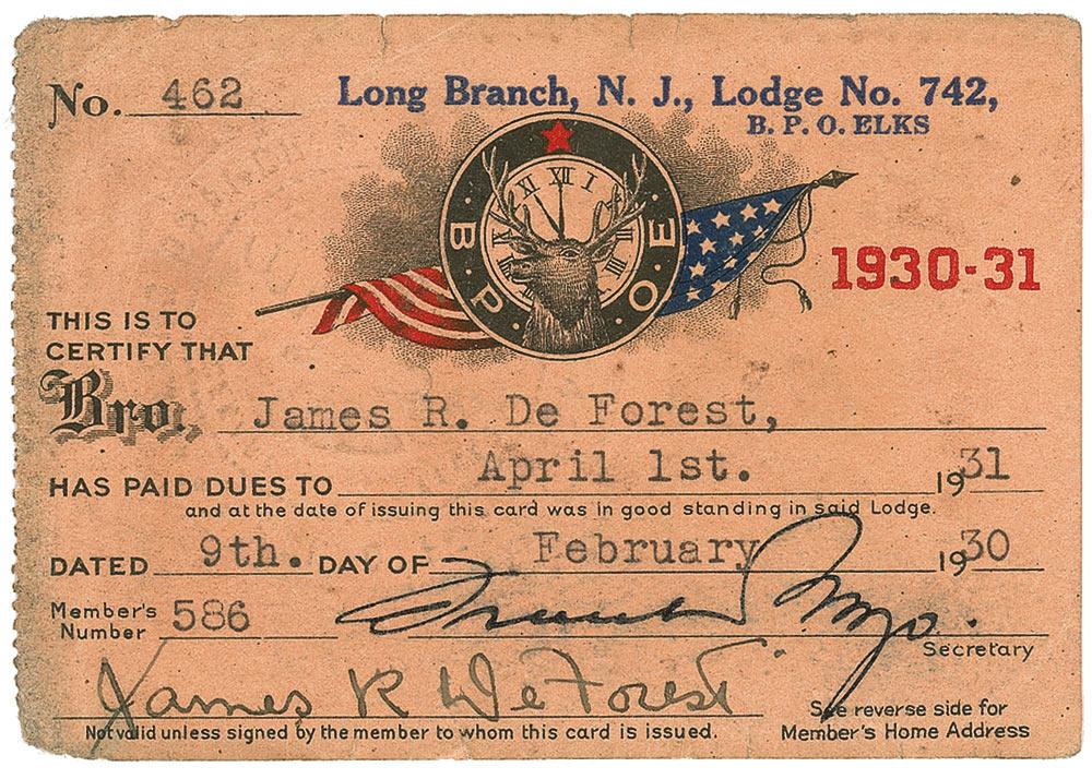 Boxing trainer for Jack Dempsey and Jess Willard. DeForest’s 1930 Long Branch New Jersey Elks Club membership card, 3.75 x 2.75, filled out in type and signed at the bottom, “James R. DeForest,” who has also added his New Jersey address on the reverse. In very good condition, with expected wear, some small edge tears to top, and scattered soiling. RRAuction COA.