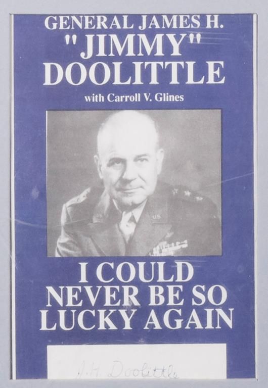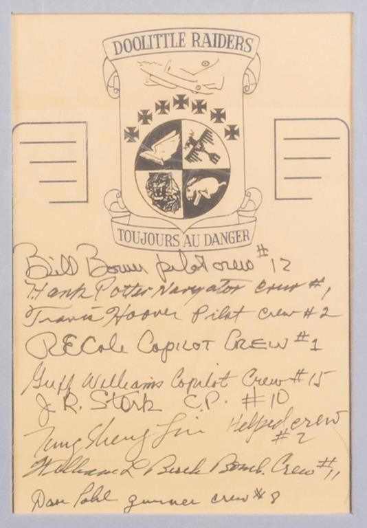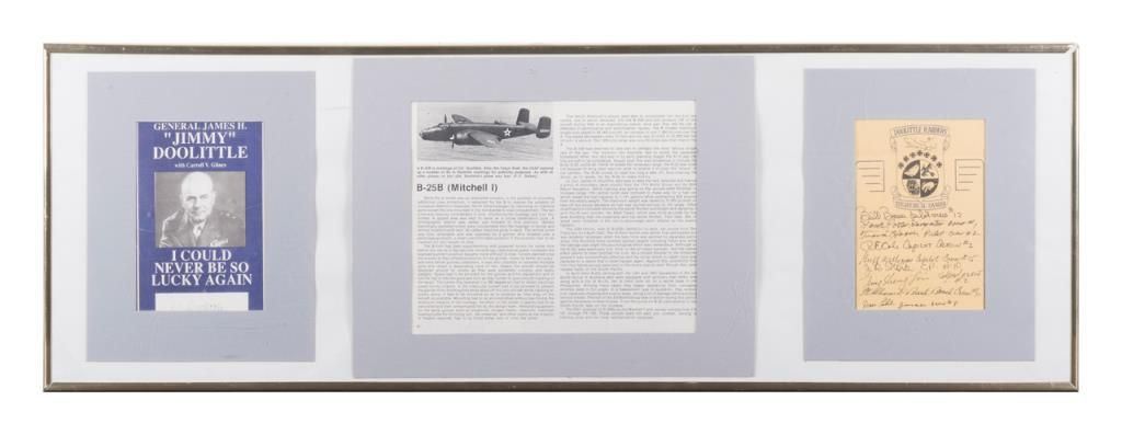 Jimmy Doolittle framed display with signature, story and stationary showing names of pilots and crew members each signed in pen at a re-union of Doolittle’s Raiders; a great piece of WW II collector memorabilia! Est.: $150-$300.