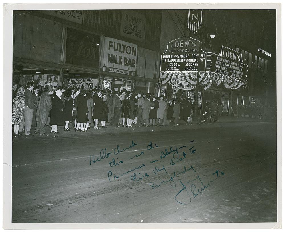 Vintage glossy 10 x 8 photo of crowds lining up to see the Frank Sinatra film ‘It Happened in Brooklyn,’ signed and inscribed in fountain pen “Hello Chuck, this was the Premiere in Bklyn. Give my best to everybody. Jimmy Durante.” In very good condition with creasing, surface crazing, a few scratches, a small tear along the left border, and irregular ink flow to “Jimmy.”