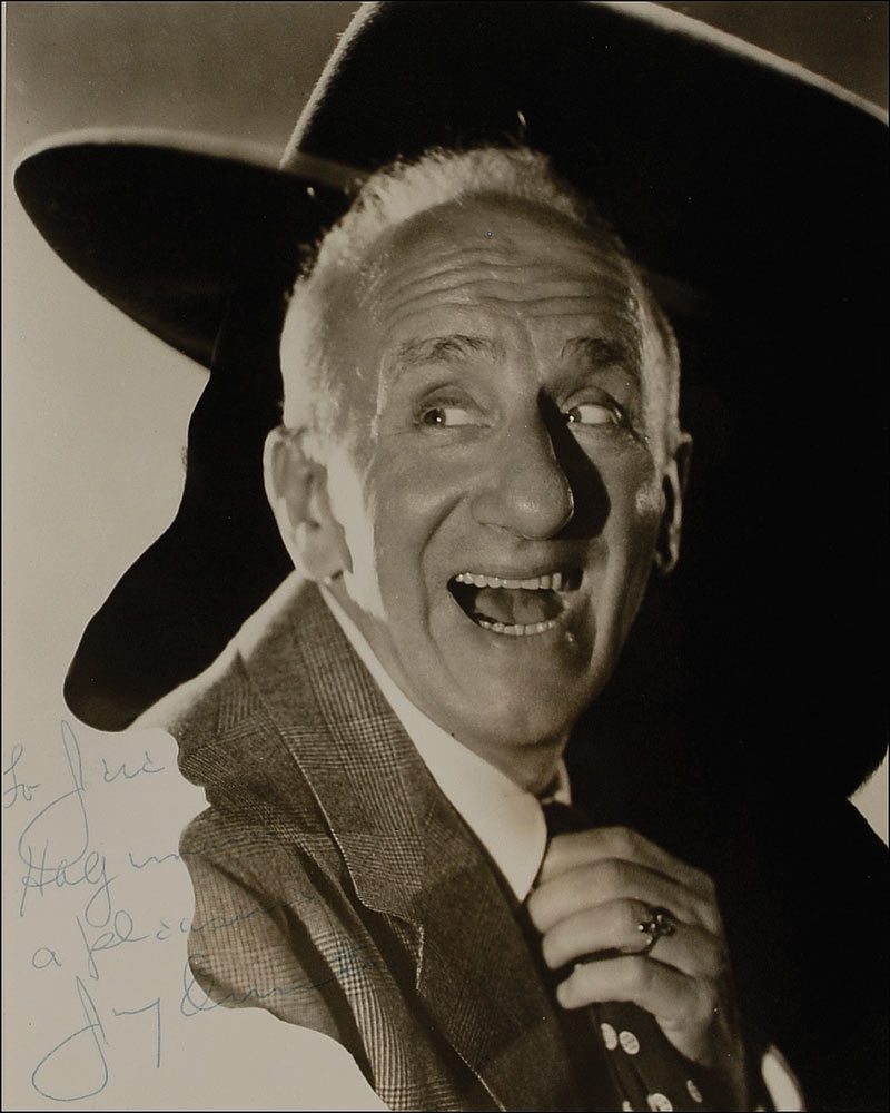 Vintage matte-finish 7.25 x 9 photo of a jovial Durante set within a larger, shadowed profile image, signed and inscribed in blue ballpoint, “To Jere Hagman, a pleasure, Jimmy Durante.” Double matted to an overall size of 11 x 14. In fine condition.