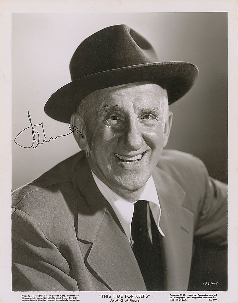 Vintage glossy 8 x 10 MGM publicity photo of Durante in This Time for Keeps, signed in fountain pen. Light scattered surface creases and impressions, otherwise fine condition.