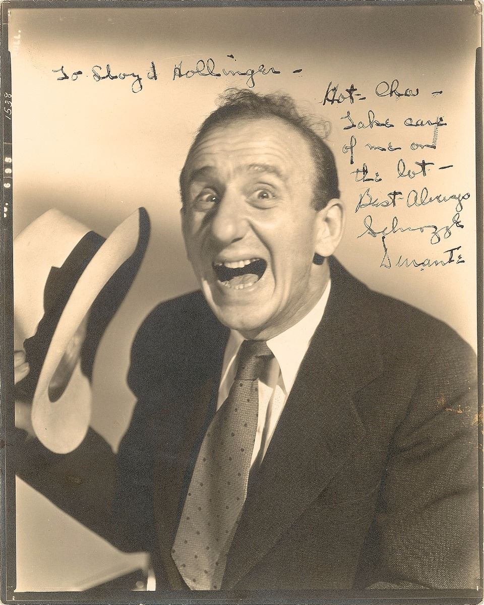 Vintage matte-finish 8 x 10 studio portrait of Durante in an excitable pose, signed and inscribed in fountain pen, “To Lloyd Hollinger—Hot–Cha—Take care of me on the lot—Best always, Schnozzle Durante.” In fine condition, with some light silvering and staining to Durante’s jacket.