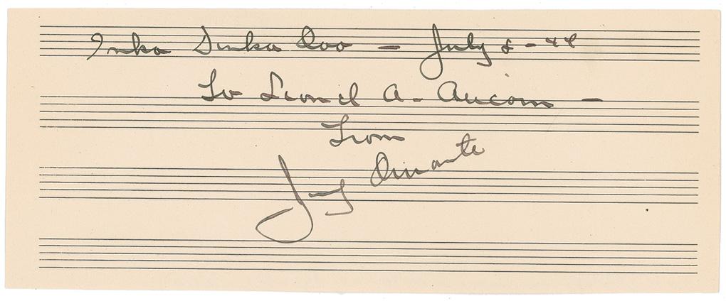 Vintage ink signature and inscription, “Inka Dinka Doo—July 8-44, To Lionel A. Aucoin, Jimmy Durante,” on an off-white 9 x 3.5 sheet of musical manuscript paper. In fine condition.