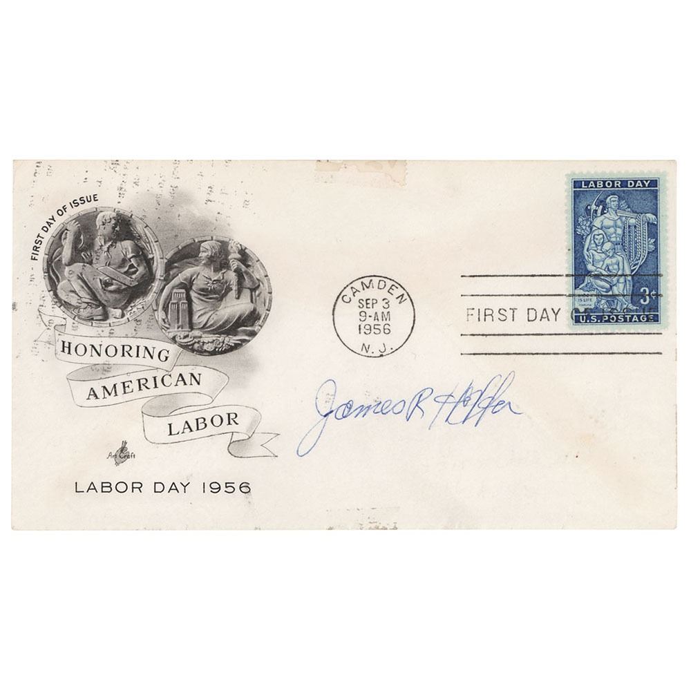 FDC with a cachet honoring American Labor, signed in blue ballpoint, "James R. Hoffa." In fine condition, with a piece of tape along the top edge.