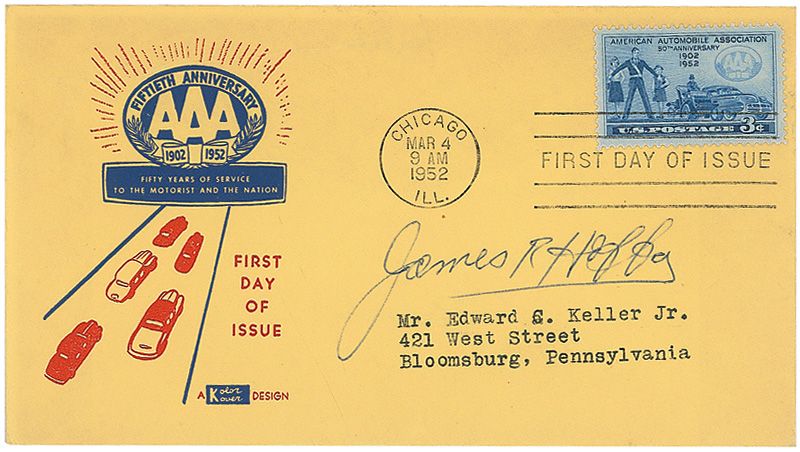 Storied, charismatic, and controversial American labor leader (1913–1975?) who attained his greatest notoriety when he vanished on July 30, 1975. The truth behind his presumed demise and the whereabouts of his remains takes a place among the most durable mysteries in modern American history. FDC with a cachet honoring the American Automobile Association, signed in blue ballpoint, “James R. Hoffa.” In fine condition, with typed mailing address under signature.