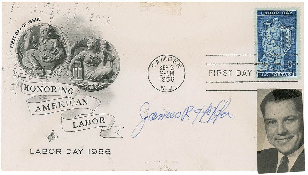 FDC with a cachet honoring American Labor, signed in blue ballpoint, “James R. Hoffa.” A small paper stock photo of Hoffa is affixed to the lower right corner. In very good condition, with scattered adhesive remnants, mostly to the upper left but slightly affecting the signature, a tape remnant to the upper border, and a tiny tear to the lower edge.