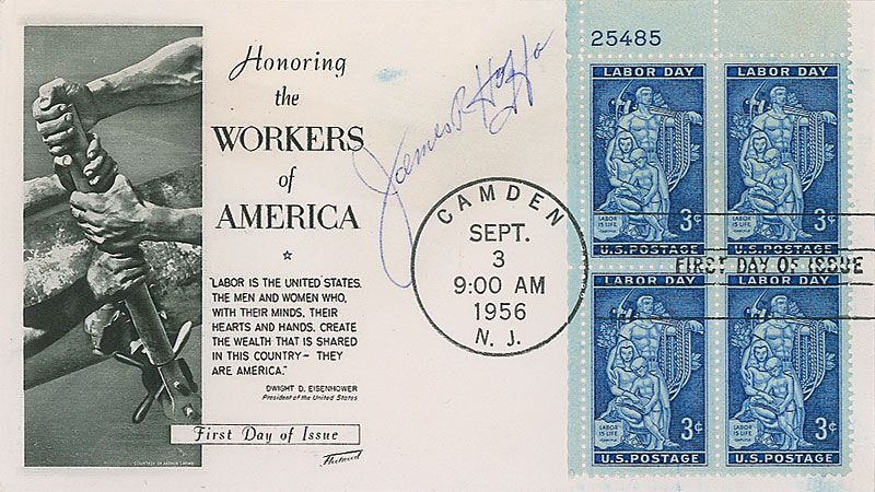 FDC with a cachet honoring the workers of America, signed in blue ballpoint, “James R. Hoffa.” In fine condition.