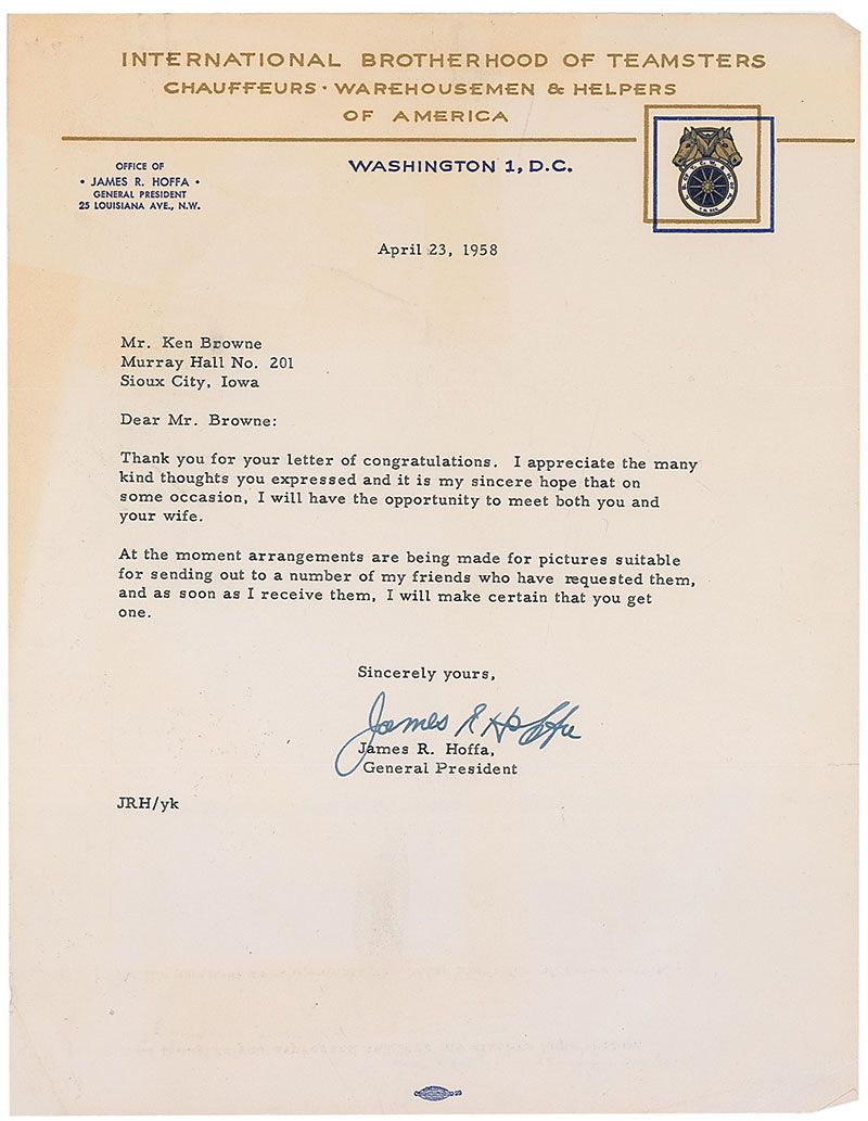 TLS signed “James R. Hoffa,” one page, 8.25 x 11, International Brotherhood of Teamsters letterhead, April 23, 1958. Letter to Ken Browne. In part: “I appreciate the many kind thoughts you expressed and it is my sincere hope that on some occasion, I will have the opportunity to meet both you and your wife. At the moment arrangements are being made for pictures suitable for sending out to a number of my friends who have requested them, and as soon as I receive them, I will make certain that you get one.” In very good condition, with staple hole to top left corner, toning to upper portion, and a few creases.