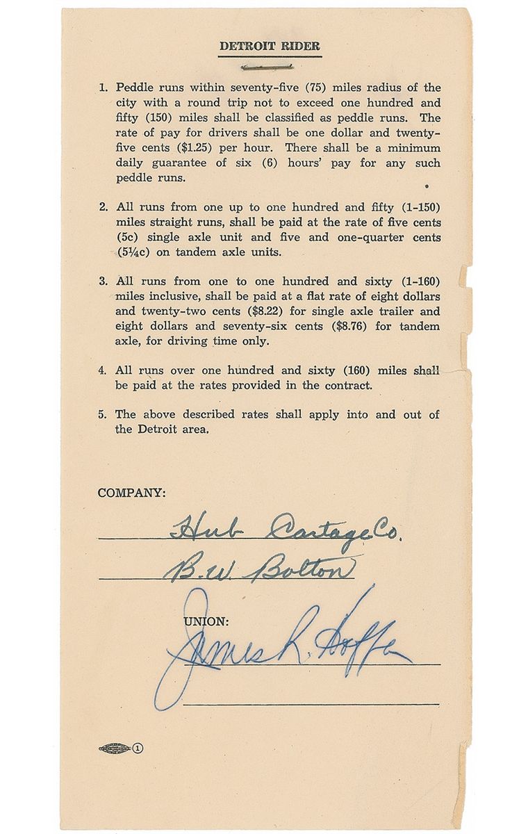 Labor union activist and leader of the International Brotherhood of Teamsters who mysteriously vanished in 1975, presumed to have been murdered due to relations with organized crime. DS, signed “James R. Hoffa,” one page, 4 x 8, no date. A “Detroit Rider” teamster-related document describing various milage and payment requirements. In part: “Peddle runs within seventy-five (75) miles of the city…The rate of pay for drivers shall be one dollar and twenty-five cents ($1.25) per hour.” In fine condition, with small tears to right edge. Accompanied by a full letter of authenticity from JSA.