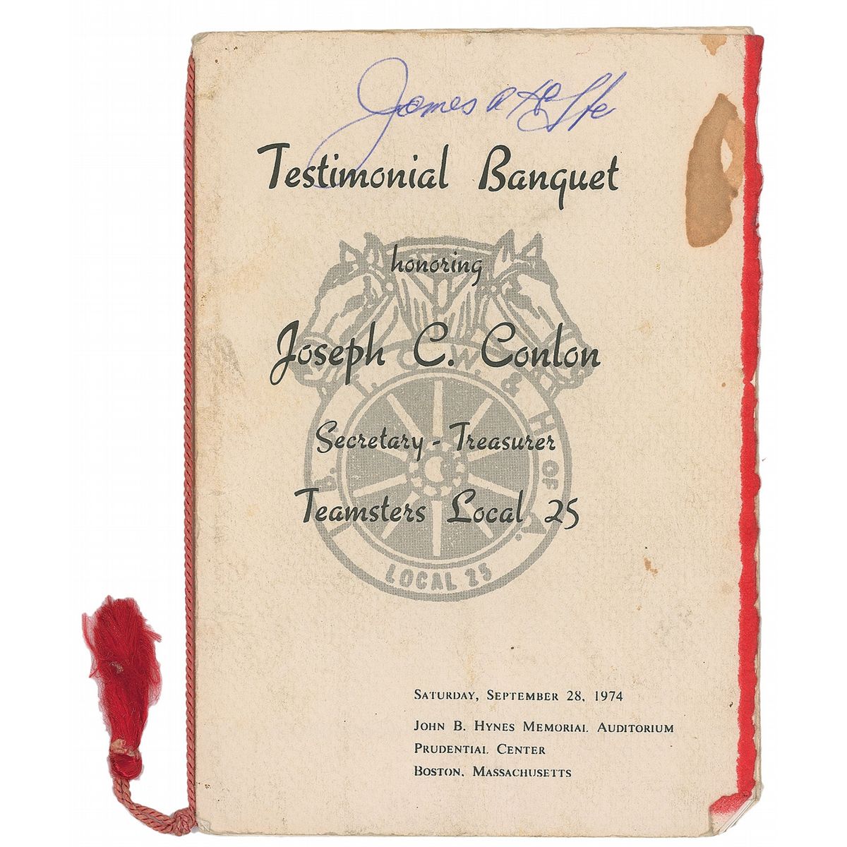 Program for a testimonial banquet honoring Secretary-Treasurer Joseph C. Conlon of Teamsters Local 25, held in Boston on September 28, 1974, 5.5 x 8, signed at the top in blue ballpoint, “James R. Hoffa.” In very good condition, with scattered stains and creases. Hoffa had become one of America’s most prominent labor leader as a Teamster figurehead beginning in the early 1950s, during which time he developed connections with organized crime. He would famously disappear the year after this banquet, mysteriously vanishing in late July.