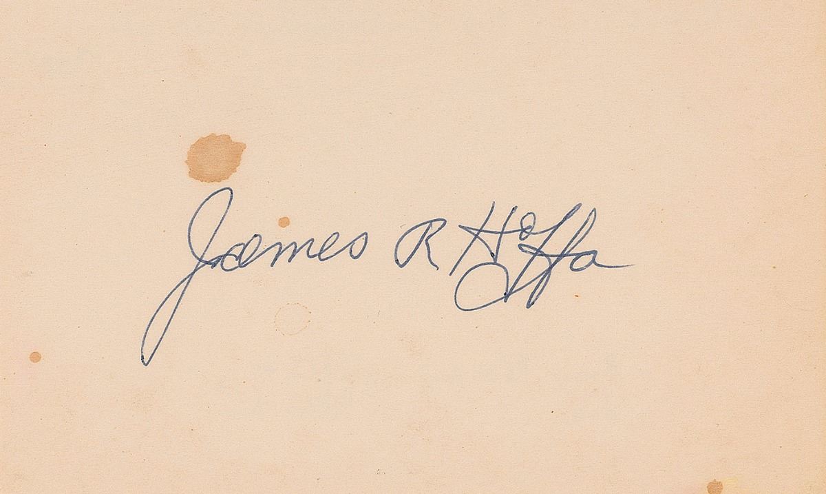 Ballpoint signature, “James R. Hoffa,” on an off-white 5 x 3 card. In fine condition, with four spots of soiling.