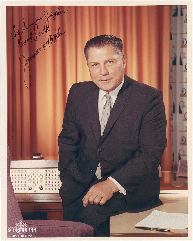 Storied, charismatic, and controversial American labor leader (1913–1975?) who attained his greatest notoriety when he vanished on July 30, 1975. The truth behind his presumed demise and the whereabouts of his remains take a place among the most durable mysteries in modern American history. Color glossy 8 x 10 photo, signed and inscribed in black felt tip “To Simon Jegher, Good luck, James R. Hoffa.” In fine condition, with a light diagonal surface mark through facial area.