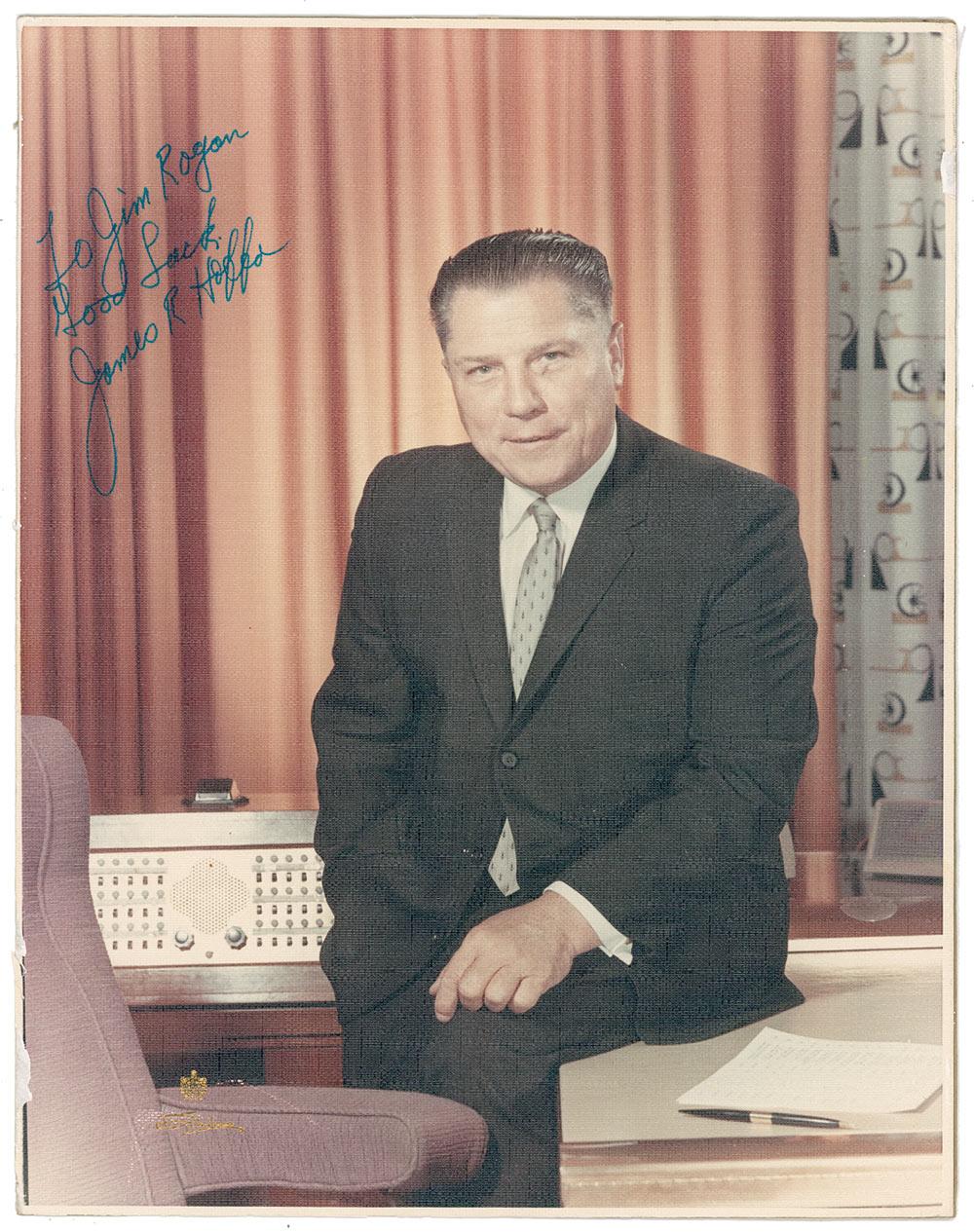 Storied, charismatic, and controversial American labor leader (1913–1975?) who attained his greatest notoriety when he vanished on July 30, 1975. The truth behind his presumed demise and the whereabouts of his remains take a place among the most durable mysteries in modern American history. Color vintage 11 x 14 textured photo of Hoffa seated on his desk, signed and inscribed in blue felt tip “To Jim Rogan, Good Luck, James R. Hoffa.” Affixed to a same-sized piece of cardstock. In fine condition, with scattered paper chipping along the extreme left edge and lightly trimmed edges. An oversized image from the larger-than-life figure.